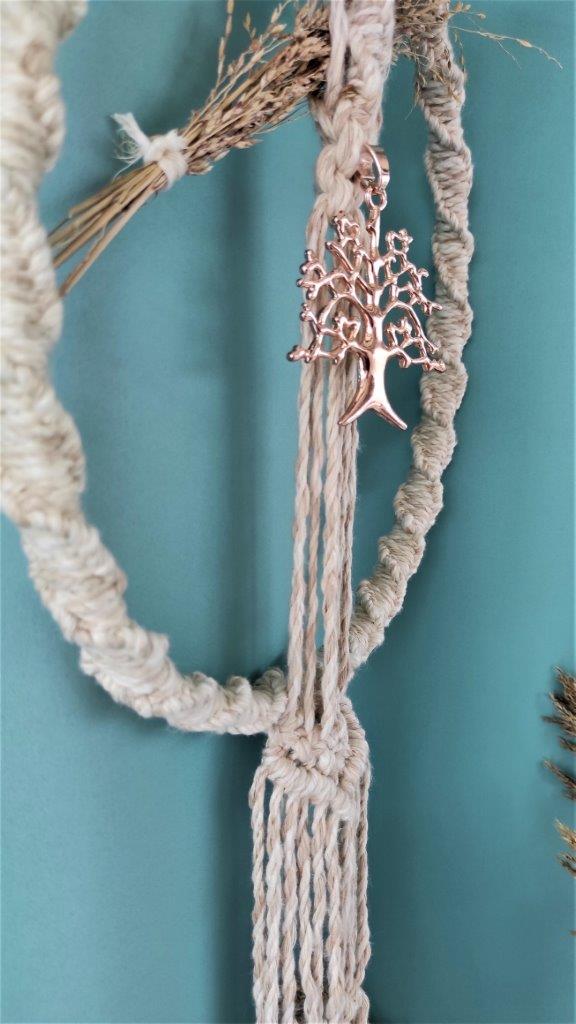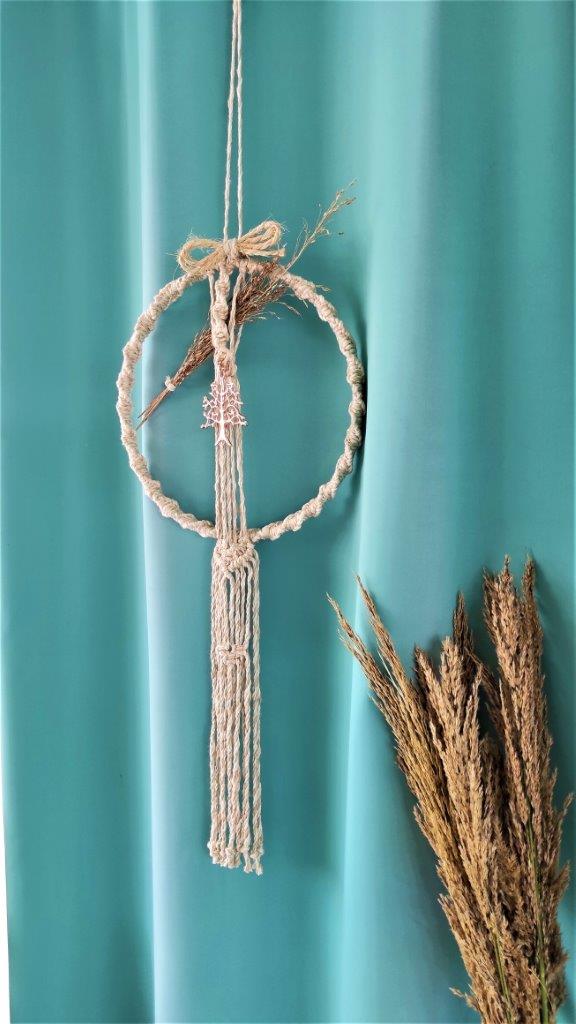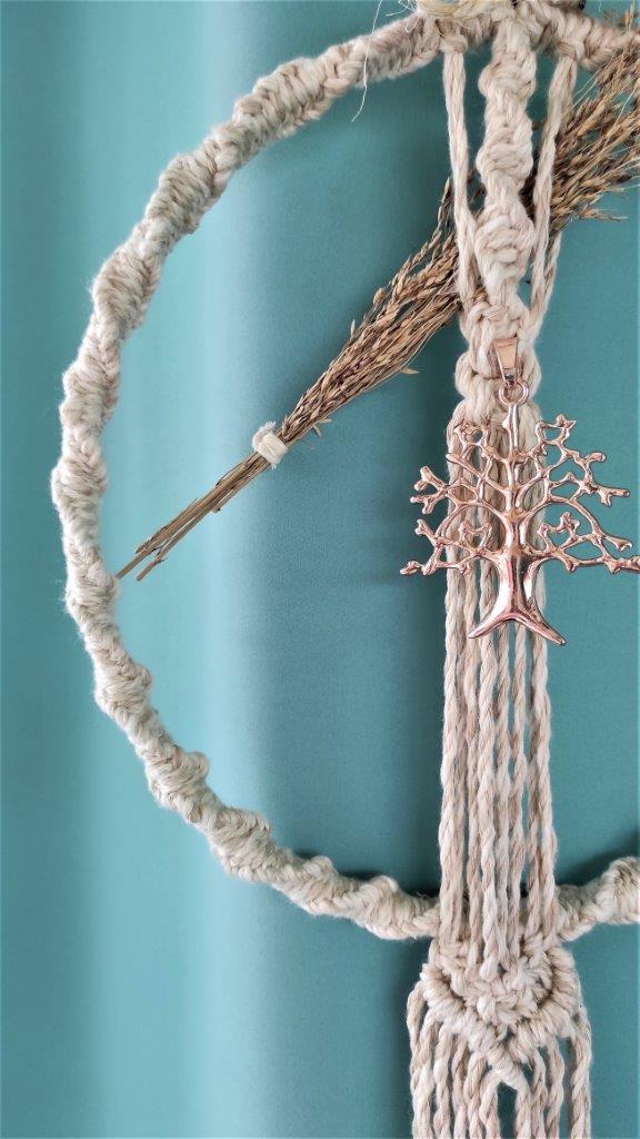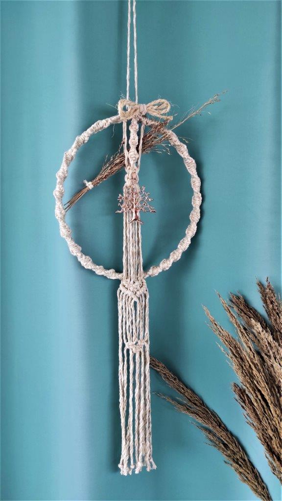 Boho χειροποίητο στεφάνι απο μπαμπού τελάρο κεντήματος πλεγμένο απο 100% ανακυκλωμένο βαμβακερό κορδόνι με την τεχνική του μακραμε .Διακοσμημένο απο αποξηραμένα φυσικά λουλούδια και απο μεταλλικό μπρούτζινο δέντρο. Ιδανικό για boho διακόσμηση σπιτιού και όχι μόνο. Οικολογικό προϊόν.