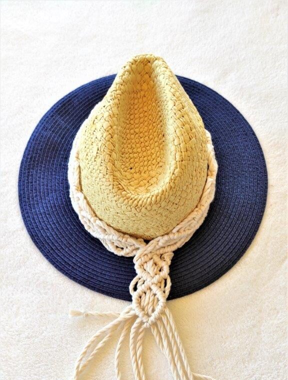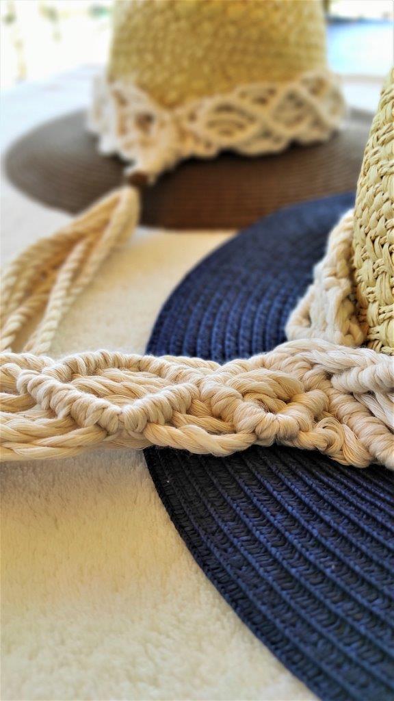Mοναδικό ψάθινο καπέλο με λεπτομέρεια πλέξης μακραμέ από 100% ανακυκλωμένο  βαμβακερό κορδόνι. Ιδανική επιλογή για όσους λατρεύουν το boho style και θέλουν να ξεχωρίσουν με τις εμφανίσεις τους το καλοκαίρι .