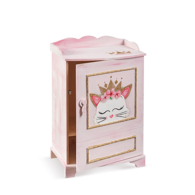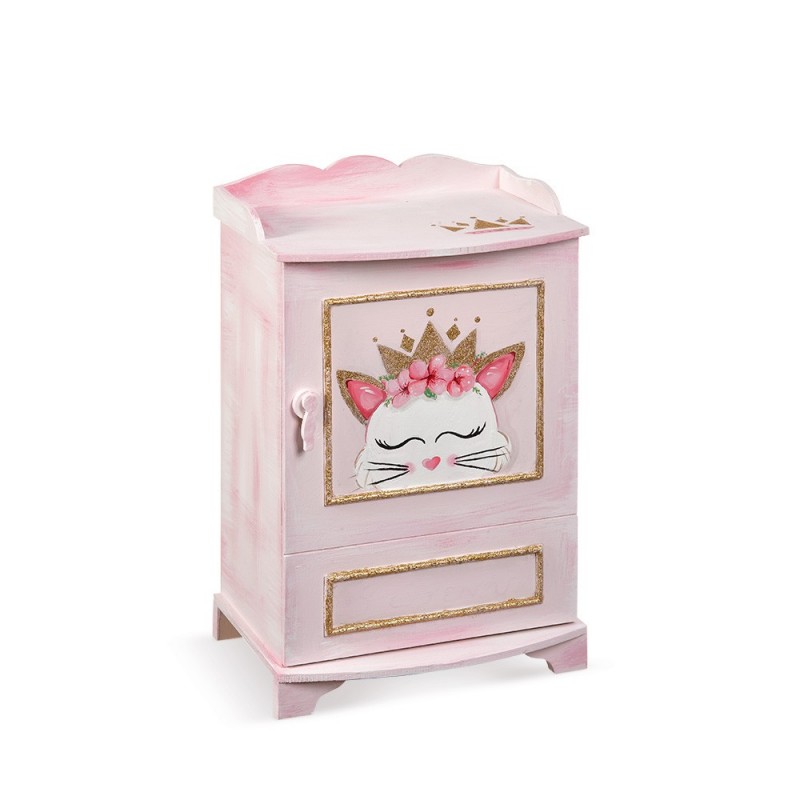 • Ξύλινο κουτί βαπτιστικών κομοδίνο σε ροζ παλ αποχρώσεις. Στο ντουλαπάκι είναι ζωγραφισμένο το πρόσωπο μιας γατούλας. Το κεφαλάκι της είναι διακοσμημένο με ροζ λουλούδια και χρυσή κορώνα. Η γάτα η ναζιάρα..είναι πάντοτε η αγαπημένη μας. Διάστ.:39,5χ30χ59cm