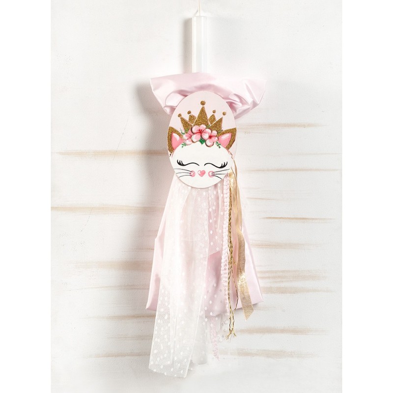 • Λαμπάδα βάπτισης με θέμα τη γάτα τη ναζιάρα σε ροζ αποχρώσεις. Είναι διακοσμημένη με ταφτά ροζ, δαντέλα τούλινη πουά και ξύλινο καδράκι με την γάτα και χρυσή κορώνα.Ύψος: 90 cm Καδράκι:18 x 24 cm