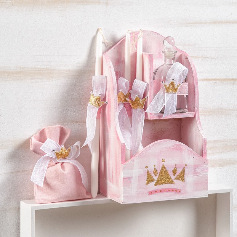 • Ξύλινη κρεμαστή συσκευασία σε ροζ απόχρωση ζωγραφισμένη με χρυσή κορώνα. Η συσκευασία περιλαμβάνει στολισμένα 3 κεριά, σαπούνι μέσα σε πουγκάκι και μπουκάλι λαδιού. Διάστ.: 20 x 34,5 cm.