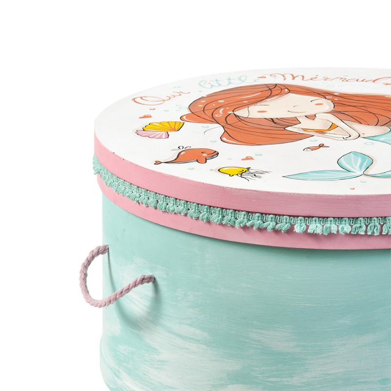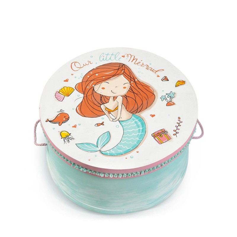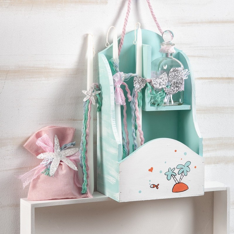 • Ξύλινο κουτί βαπτιστικών καπελιέρα με brush βεραμάν αποχρώσεις. Στην επιφάνεια είναι ζωγραφισμένη η μικρή γοργόνα τριγυρισμένη από διάφορα θαλασσινά στοιχεία. Η περίμετρος της καπελιέρας είναι διακοσμημένη με βαμβακερή βεραμάν τρέσσα με pom pom και τα χερούλια είναι φτιαγμένα από βαμβακερό ροζ κορδόνι. Η μικρή μας γοργόνα είναι έτοιμη να πάρει το όνομά της. Διάστ: 48x25cm
