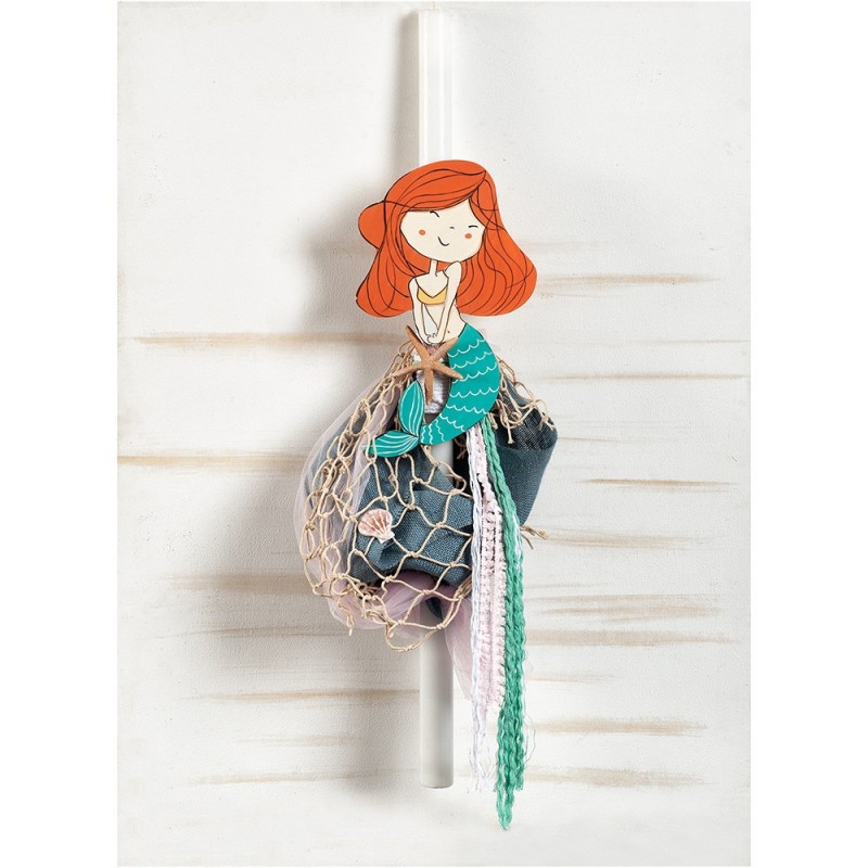 • Λαμπάδα βάπτισης με θέμα τη μικρή γοργόνα σε ξύλινη παράσταση. Είναι διακοσμημένη με σύνθεση από τούλι, λινάτσα και δίχτυ δίνοντας την αίσθηση ότι κάθεται πάνω σε έναν βράχο. Ύψος: 90 cm Γοργόνα:21 x 32 cm