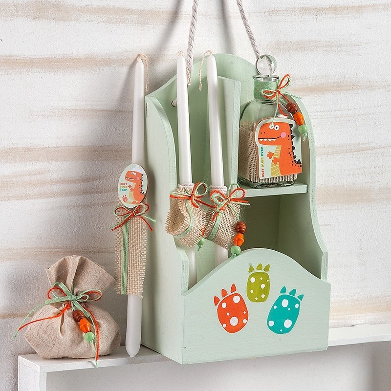 - Ξύλινη κρεμαστή συσκευασία βαμμένη σε απόχρωση πράσινη-λαδί που χρησιμεύει ως ράφι λαδικών. Στο μπροστινό μέρος έχει ζωγραφιστά πατουσάκια δεινοσαύρου πορτοκαλί-πράσινα και τιρκουάζ.Ο κωδικός περιλαμβάνει τα 3 κεράκια,το σαπούνι μέσα σε πουγκάκι και το μπουκάλι του λαδιού,όλα στολισμένα σε φυσικές-πορτοκαλί-πράσινες αποχρώσεις με κορδέλες. Διάστ.: 20×34,5cm