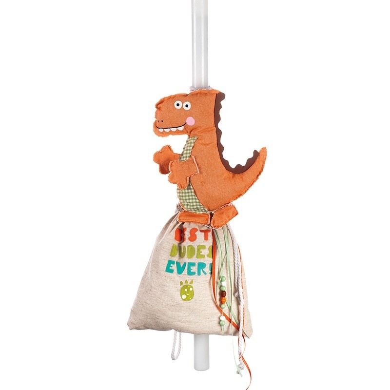 - Λαμπάδα βάπτισης,διακοσμημένη με λινή τσάντα πάνω στην οποία είναι ζωγραφισμένη η φράση BEST DUDES EVER. Τη λαμπάδα διακοσμεί επίσης ένας εντυπωσιακός πάνινος δεινόσαυρος ενώ από την τσάντα κρέμονται κορδέλες πορτοκαλί και πράσινες με πολύχρωμες χάντρες. Ύψος: ~90cm