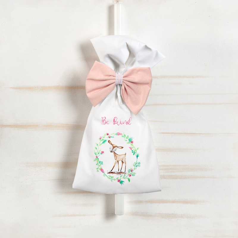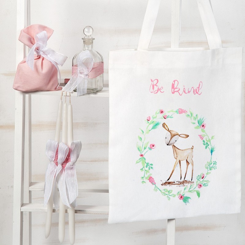 • Ζωγραφιστή υφασμάτινη τσάντα με 3 κεριά,σαπούνι και μπουκάλι λαδιού στολισμένα σε ροζ,λευκές αποχρώσεις. Η τσάντα είναι ζωγραφιστή στο μπροστινό κομμάτι με θέμα μικρό ελαφάκι.Διάστ.: 35 x 41 x 70 cm.