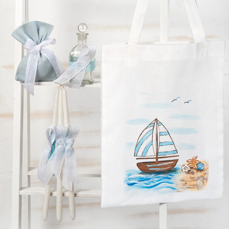 - Ζωγραφιστή υφασμάτινη τσάντα με 3 κεριά,σαπούνι και μπουκάλι λαδιού στολισμένα σε σιέλ,λευκές αποχρώσεις. Η τσάντα είναι ζωγραφιστή στο μπροστινό κομμάτι με θέμα καραβάκι στον γιαλό. Διάστ.: 35 x 41 x 70 cm.