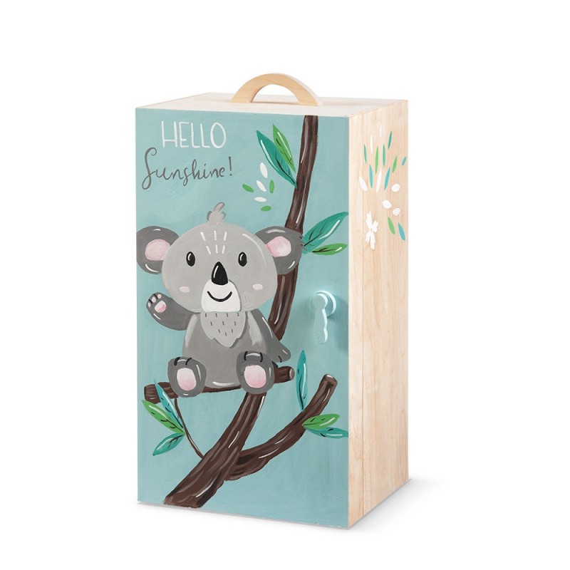 • Ξύλινο κουτί βαπτιστικών ντουλάπα με εσωτερικά ραφάκια και κρεμάστρα για το ρούχο. Το φόντο είναι βεραμάν με το πιο γλυκό κοάλα που μας χαιρετάει χαμογελαστό. Το κοάλα απεικονίζεται πάνω σε ξύλινο κλαδί δέντρου ενώ το Hello sunshine παραπέμπει σε μια από τις πιο φωτεινές στιγμές για το μικρό αγγελούδι σας. Διάστ.: 32x24x61cm