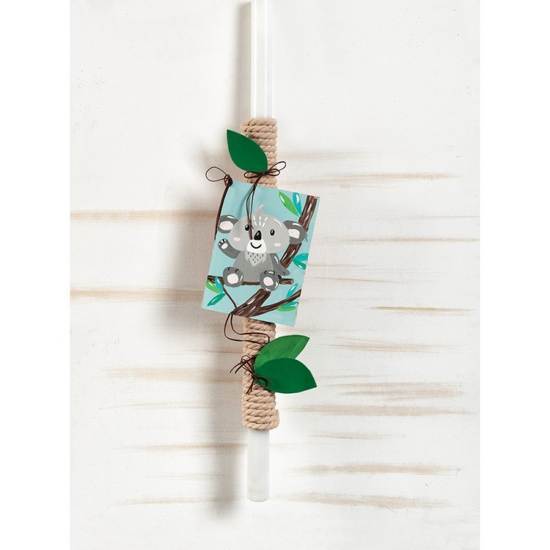 • Η λαμπάδα είναι διακοσμημένη με ξύλινη παράσταση κοάλα να μας χαιρετάει πάνω σε ένα κλαδί δέντρου. Η λαμπάδα είναι τυλιγμένη με υφασμάτινο κορδόνι σε καφέ απόχρωση και διακοσμημένη με τσόχινα φύλλα δέντρου.Ύψος: 90 cm Καδράκι: 25 x 17cm