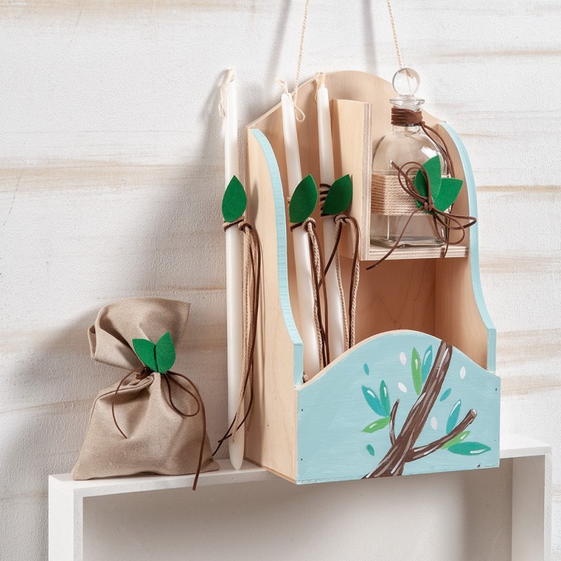 • Ξύλινη κρεμαστή συσκευασία σε natural και βεραμάν απόχρωση ζωγραφισμένη με ξύλινο κλαδί δέντρου και φύλλα. Η συσκευασία περιλαμβάνει στολισμένα 3 κεριά,σαπούνι μέσα σε πουγκάκι και μπουκάλι λαδιού. Διάστ.: 20 x 34,5 cm.