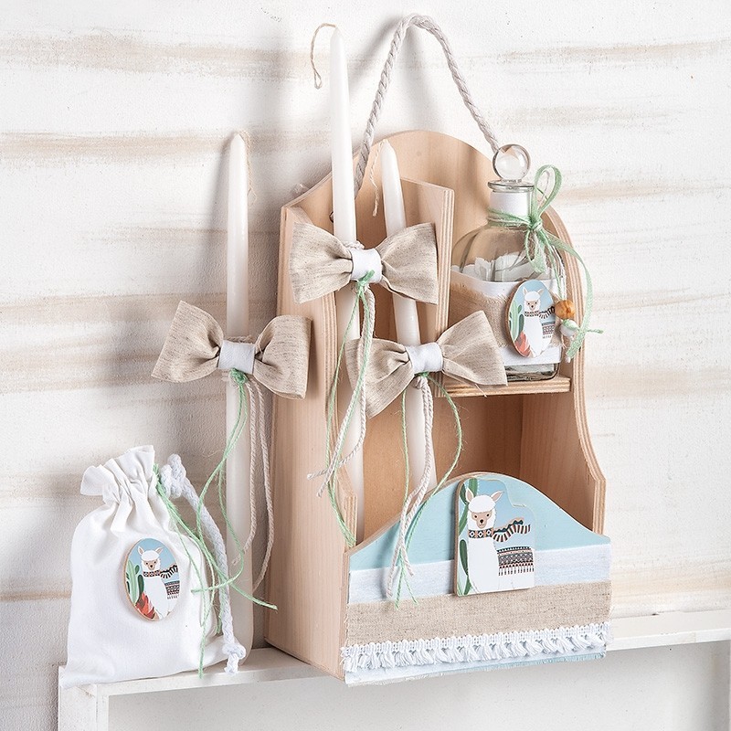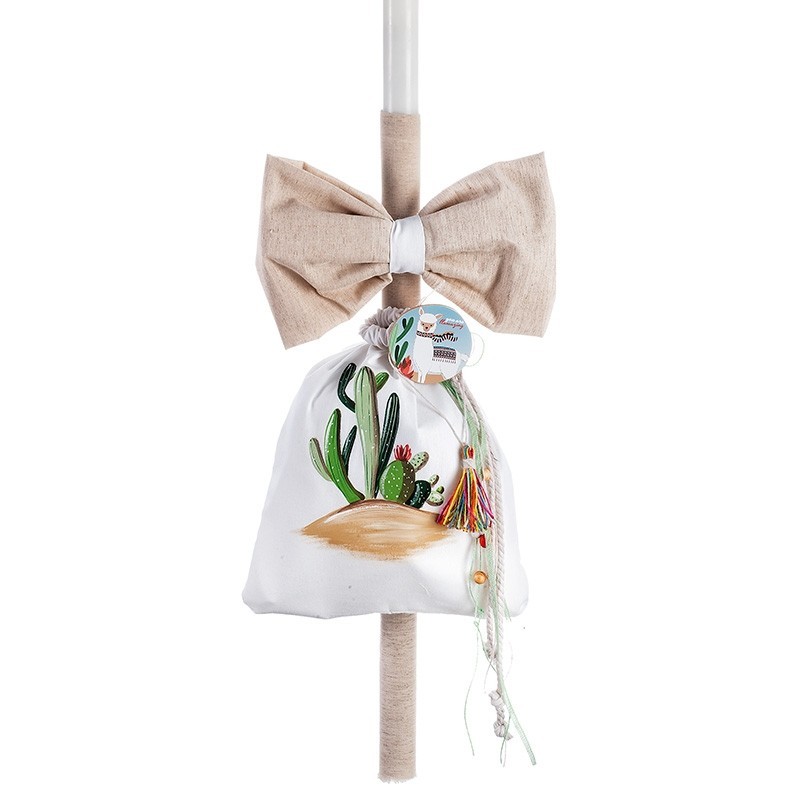 • Λαμπάδα βάπτισης,ντυμένη με ύφασμα λινό μπεζ και διακοσμημένη με ζωγραφιστή βαμβακερή τσάντα λευκή πάνω στην οποία απεικονίζονται διαφόρου μεγέθους κάκτοι.Το πάνω μέρος της τσάντας διακοσμεί ξύλινο κόπτικο με παράσταση λάμα και φουντίτσα από πολύχρωμα κορδόνια,ενώ η λαμπάδα στο πάνω μέρος της διακοσμείται και από έναν μεγάλο λινό φιόγκο μπεζ. Ύψος: ~90cm