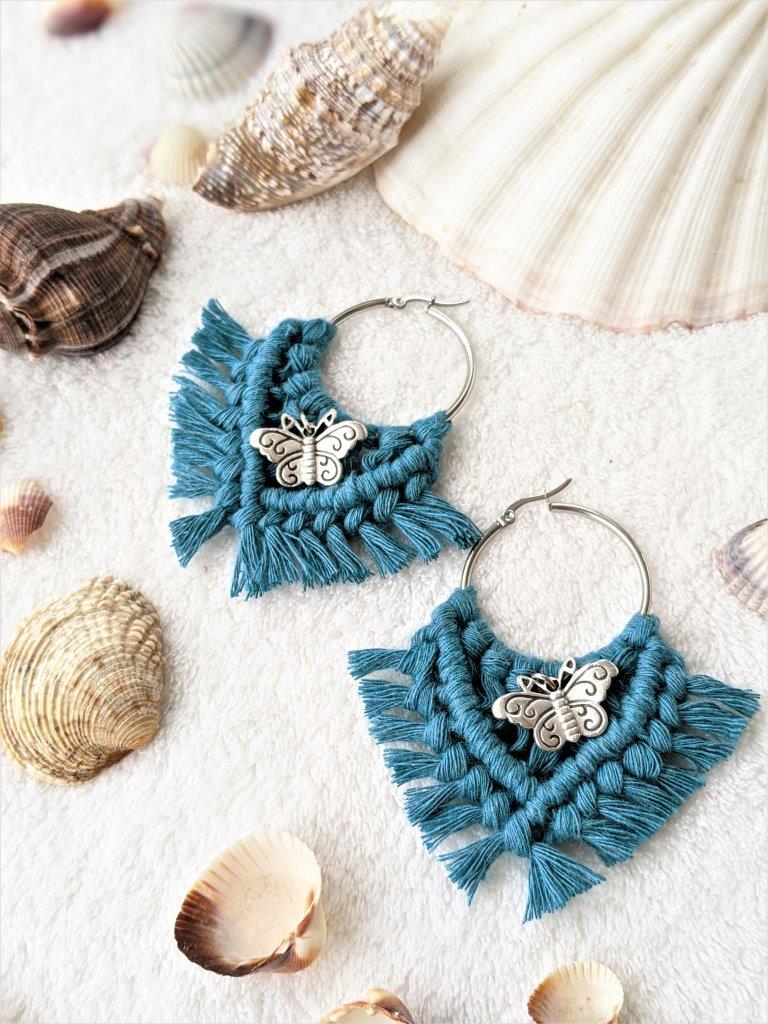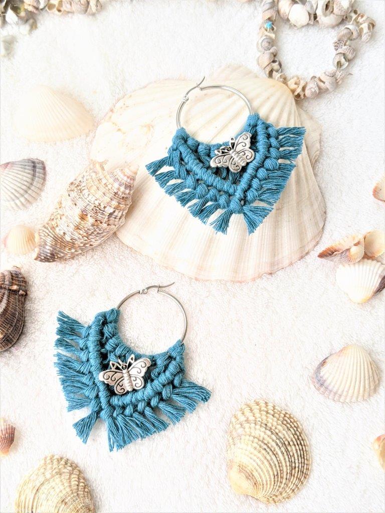 Μοναδικά χειροποίητα μοντέρνα κρεμαστά macrame σκουλαρίκια  με 100% ανακυκλωμένο  κορδόνι σε χρώμα θαλλασί ,πλεγμένα πάνω σε ατσάλινο κρίκο. Ιδανική επιλογή για όσους λατρεύουν το boho style. Συνοδεύεται από προσεγμένο χάρτινο κραφτ κουτί συσκευασίας φιλικό προς το περιβάλλον.