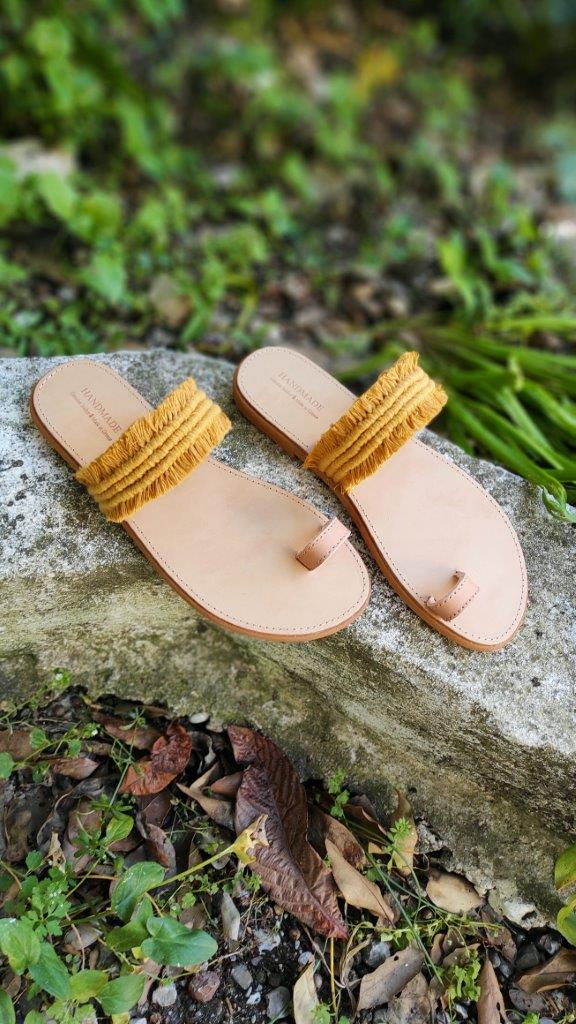 Μοναδικά χειροποίητα δερμάτινα  σανδάλια ελληνικής κατασκευής διακοσμημένα με μουσταρδί χειροποίητη πλέξη μακραμέ. Ιδανική επιλογή για όσες λατρεύουν το bohostyle. Διαθέσιμα κατόπιν παραγγελίας και σε άλλες αποχρώσεις πλέξης .
