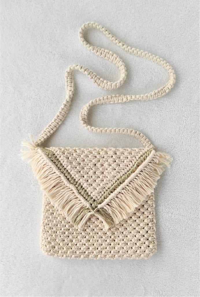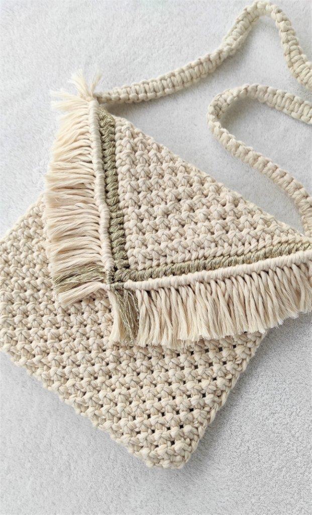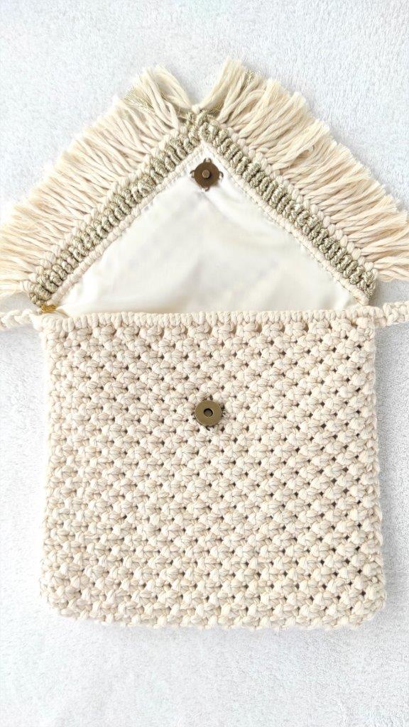Boho χειροποίητη μακραμέ τσάντα με  λουρί και χρυσή λεπτομέρεια , πλεγμένη εξ ολοκλήρου στο χέρι με 100% ανακυκλωμένο βαμβακερό σχοινί. Επενδυμένη με  σατέν φόδρα και vintage κούμπωμα. Μπορεί να σας συνοδεύσει σε όλες τις εμφανίσεις σας από το πρωί ως το βράδυ. Μια διαχρονική επιλογή τσάντας που θα απογειώσει το στυλ και την εμφάνιση σας. Διατίθεται σε πολλές αποχρώσεις.