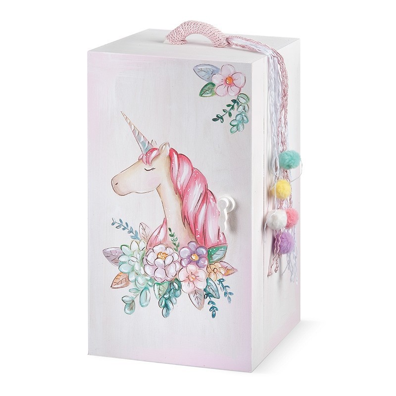 - Ξύλινη ντουλάπα με χεράκι,συσκευασία βάπτισης βαμμένη λευκή με σβησίματα ροζ και ζωγραφισμένη στο χέρι στο μπροστινό τμήμα με θέμα τον μονόκερο ανάμεσα σε πολύχρωμα λουλούδια.Το χεράκι της ντουλάπας είναι ντυμένο με rayon ροζ κορδόνι και από αυτό κρέμονται διάφορα πολύχρωμα pompom,ενώ όλο το κουτί έχει σβησίματα ροζ. Διάστ.: 32x24x61cm