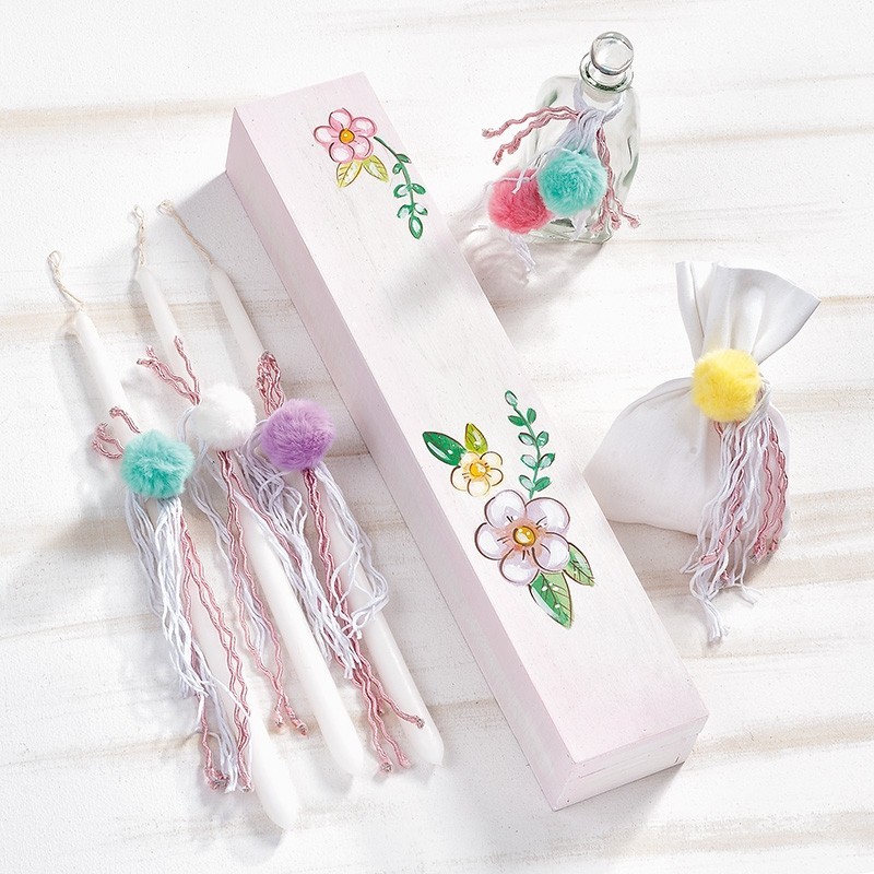 - Ξύλινο natural κουτί συσκευασίας παραλληλόγραμμο βαμμένο λευκό με ροζ σβησίματα και ζωγραφισμένο στο χέρι με πολύχρωμα λουλούδια.Ο κωδικός περιλαμβάνει τα 3 κεράκια,το σαπούνι μέσα σε πουγκάκι και το μπουκάλι του λαδιού,όλα στολισμένα σε λευκές-ροζ αποχρώσεις με πολύχρωμα pompom Διάστ.: 47χ9cm