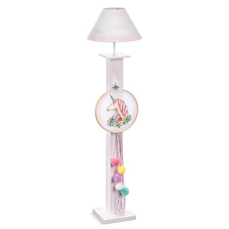- Ξύλινο φωτιστικό-κρεμάστρα,βαμμένο λευκό με ροζ σβησίματα και διακοσμημένο με ξύλινο τελάρο κεντήματος πάνω στο ύφασμα του οποίου έχει ζωγραφιστεί στο χέρι παράσταση με μονόκερο σε ροζ απόχρωση με πολύχρωμα λουλούδια.Από την κρεμαστρούλα,κρέμονται κορδόνια rayon λευκά-ροζ με πολύχρωμα pompom. Βάση: 16 x 16 cm Ύψος: 92 cm