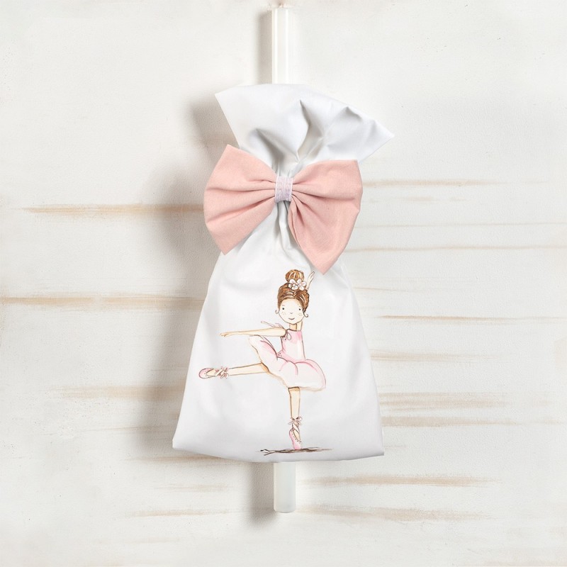 • Λαμπάδα βάπτισης με θέμα μικρή μπαλαρίνα με την ροζ στολή της και τις πιρουέτες της. Είναι δεμένη με 2 φιόγκους υφασμάτινους,ο ένας σε λευκό και ο άλλος σε ροζ χρώμα. Στο λευκό φιόγκο έχει χρησιμοποιηθεί τεχνική ζωγραφικής πάνω σε ύφασμα με θέμα μικρή μπαλαρίνα που χορεύει. Ύψος: 90 cm