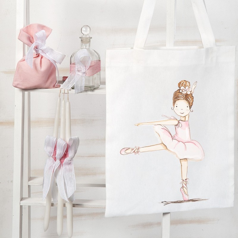 • Ζωγραφιστή υφασμάτινη τσάντα με 3 κεριά,σαπούνι και μπουκάλι λαδιού στολισμένα σε ροζ,λευκές αποχρώσεις. Η τσάντα είναι ζωγραφιστή στο μπροστινό κομμάτι με θέμα μικρή μπαλαρίνα που χορεύει. Διάστ.: 35 x 41 x 70 cm.