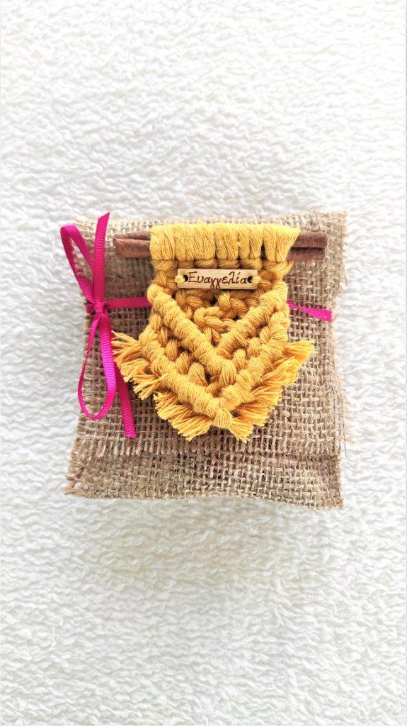 Μοναδικό χειροποίητο μοντέρνο macramé  μαγνητάκι από ανακυκλωμένο βαμβακερό κορδόνι, με το όνομα ή την ημερομηνία της επιλογής σας. Ιδανική επιλογή τόσο για μπομπονιέρα βάπτισης όσο και για αναμνηστικό γεννήσεως.  Μια ιδιαίτερη πρόταση για οικονομικό χειροποίητο παιδικό δώρο. Διατίθεται σε διάφορες αποχρώσεις. Ελάχιστη παραγγελία  25  τεμάχια.