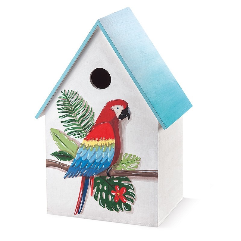 - Ξύλινο natural κλουβί-σπιτάκι,συσκευασία βάπτισης ζωγραφισμένη στο χέρι με θέμα τον παπαγάλο.Η σκεπή είναι ζωγραφισμένη λευκή-τιρκουάζ,ενώ μπροστά είναι ζωγραφισμένος ένας εντυπωσιακός παπαγάλος με υπέροχα ζωντανά χρώματα ο οποίος κάθεται πάνω σε κλαδί δεντρού και είναι περιτριγυρισμένος από διάφορα τροπικά φυτά. Διάστ.: 38x28x57,5 cm