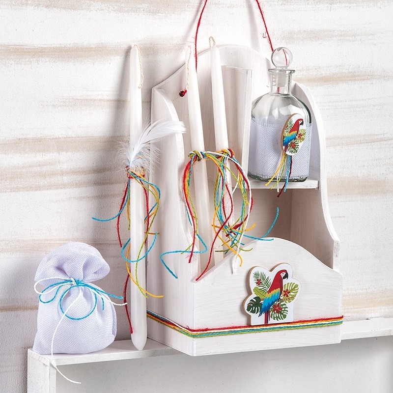 - Ξύλινη natural κρεμαστή συσκευασία βαμμένη λευκή που χρησιμεύει ως ράφι λαδικών. Στο μπροστινό μέρος έχει ξύλινη παράσταση με παπαγάλο.Ο κωδικός περιλαμβάνει τα 3 κεράκια,το σαπούνι μέσα σε πουγκάκι και το μπουκάλι του λαδιού,όλα στολισμένα σε πολύχρωμες αποχρώσεις. Διάστ.: 20×34,5cm
