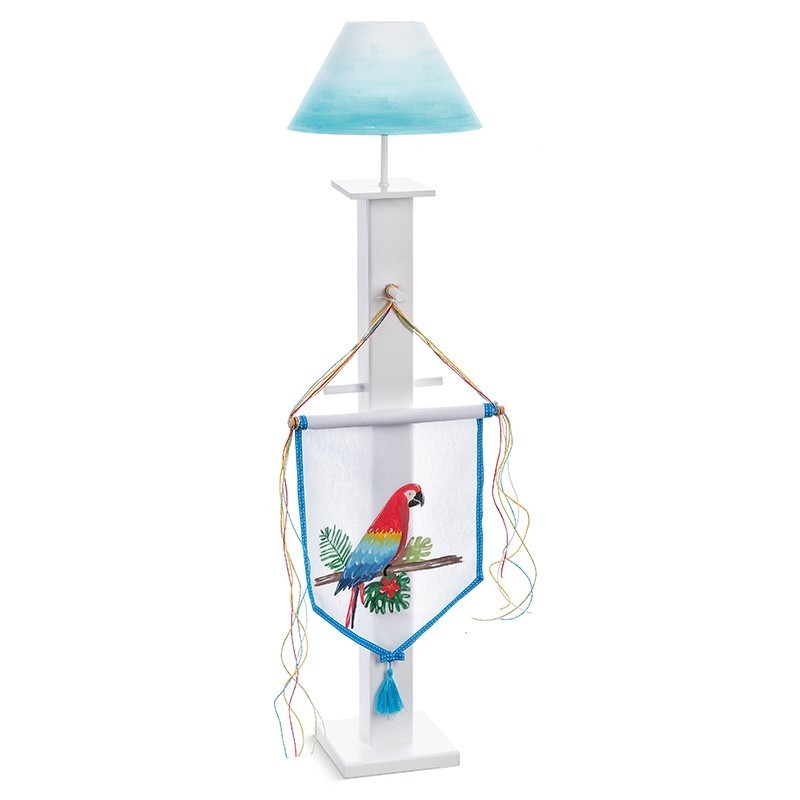 - Ξύλινο λευκό φωτιστικό-κρεμάστρα με καπέλο βαμμένο λευκό με τιρκουάζ τελείωμα και διακοσμημένο με ξύλινη βέργα από την οποία κρέμεται ύφασμα λευκό σε στυλ σημαίας και πάνω στο οποίο είναι ζωγραφισμένος ένας εντυπωσιακός παπαγάλος περιτριγυρισμένος από τροπικά φυτά.Από την κρεμαστρούλα κρέμονται κορδόνια πολύχρωμα ενώ στην τιμή περιλαμβάνεται και το κερί για την εκκλησία το οποίο συνοδεύεται από μία βάση που μπαίνει στη θέση του καπέλου του φωτιστικού. Βάση: 16 x 16 cm Ύψος: 92 cm