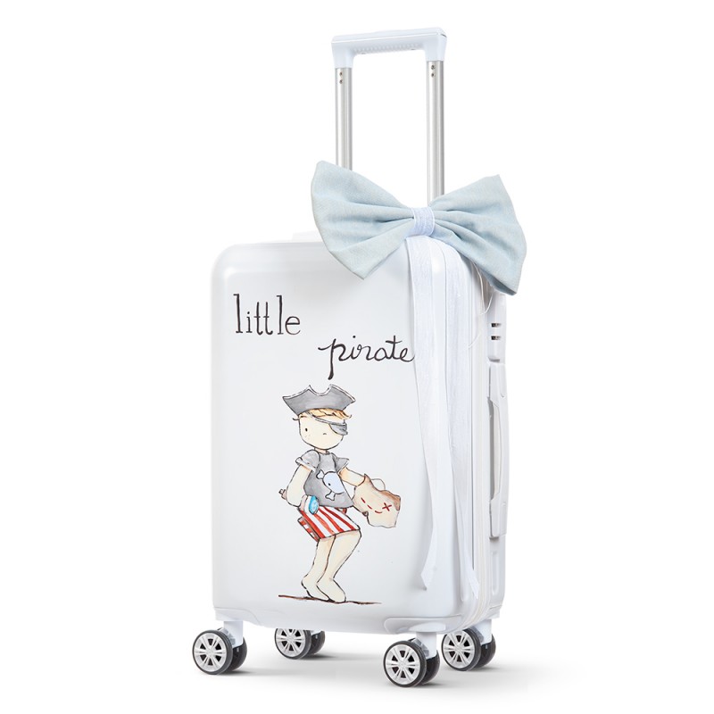 • Ζωγραφιστή βαλίτσα trolley για βαπτιστικά σε άσπρο γυαλιστερό χρώμα. Το θέμα της ζωγραφικής είναι ο μικρός πειρατής που κρατάει το χάρτη και αναζητάει τον κρυμμένο θησαυρό. Η περιπέτεια μόλις ξεκίνησε. Στο πάνω μέρος της βαλίτσας ο υφασμάτινος σιέλ φιόγκος προσθέτει μια μοντέρνα διακόσμηση. Διαστάσεις: 35x21x49cm Ύψος με ρόδες:56cm Ύψος με το χερούλι: 77-101cm