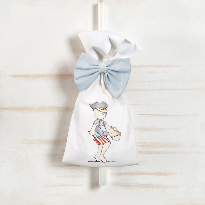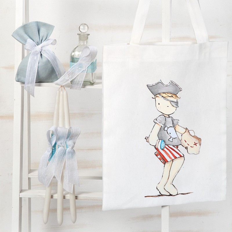 • Ζωγραφιστή υφασμάτινη τσάντα με 3 κεριά,σαπούνι και μπουκάλι λαδιού στολισμένα σε σιέλ,λευκές αποχρώσεις. Η τσάντα είναι ζωγραφιστή στο μπροστινό κομμάτι με θέμα μικρός πειρατής. Διάστ.: 35 x 41 x 70 cm.