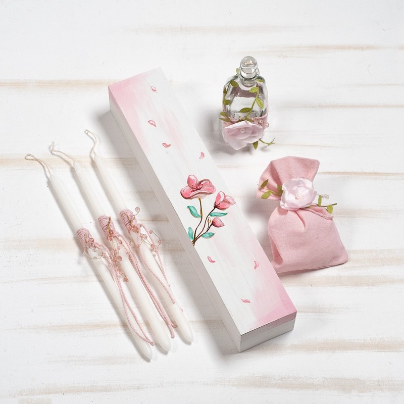 • Ξύλινο κουτί συσκευασίας παραλληλόγραμμο ζωγραφισμένο με λουλούδια στις αποχρώσεις του ροζ. Ο κωδικός περιλαμβάνει στολισμένα 3 κεράκια, σαπούνι μέσα σε πουγκάκι και μπουκάλι του λαδιού. Διάστ : 47x9cm