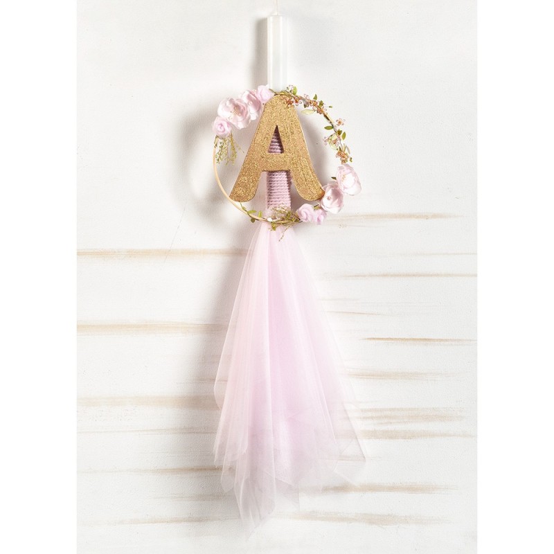 • Η λαμπάδα είναι διακοσμημένη σε ροζ απαλές αποχρώσεις. Το επάνω μέρος είναι τυλιγμένο με ροζ βαμβακερό κορδόνι και στο κάτω μέρος πέφτει χυτό ροζ τούλι. Η συγκεκριμένη πρόταση συμπληρώνεται από ένα στεφάνι γεμάτο λουλούδια και το χρυσό μονόγραμμα του παιδιού. Ύψος: 90 cm