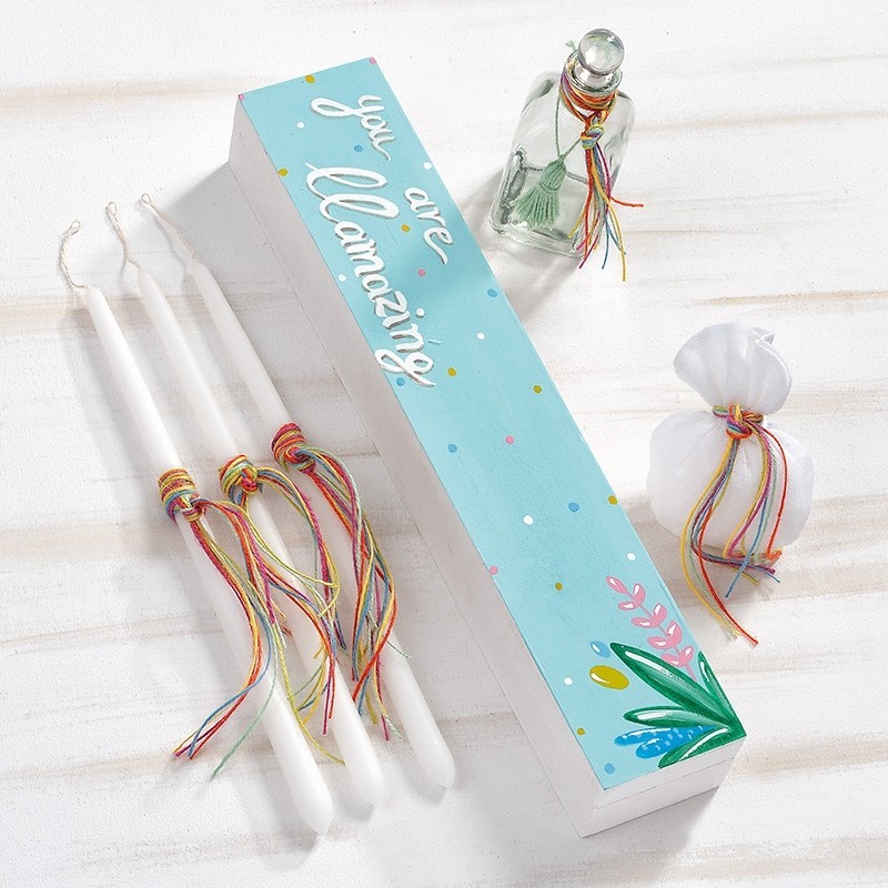 - Ξύλινο natural κουτί συσκευασίας παραλληλόγραμμο, βαμμένο λευκό με βεραμάν και ζωγραφισμένο στο χέρι με θέμα το λάμα και με πολύχρωμα πουά μικρά και λουλούδια.Πάνω του αναγράφεται η πρόταση “you are llamazing”!Ο κωδικός περιλαμβάνει τα 3 κεράκια,το σαπούνι μέσα σε πουγκάκι και το μπουκάλι του λαδιού,όλα στολισμένα σε λευκές-ροζ αποχρώσεις με πολύχρωμα κορδόνια. Διάστ.: 47χ9cm
