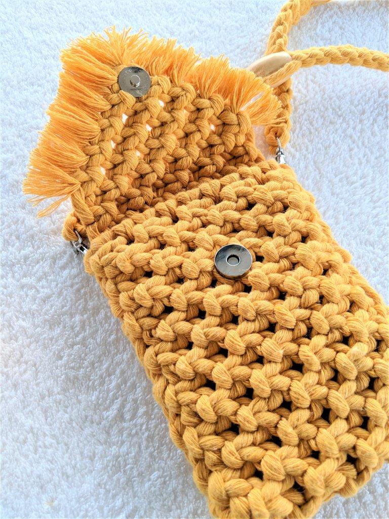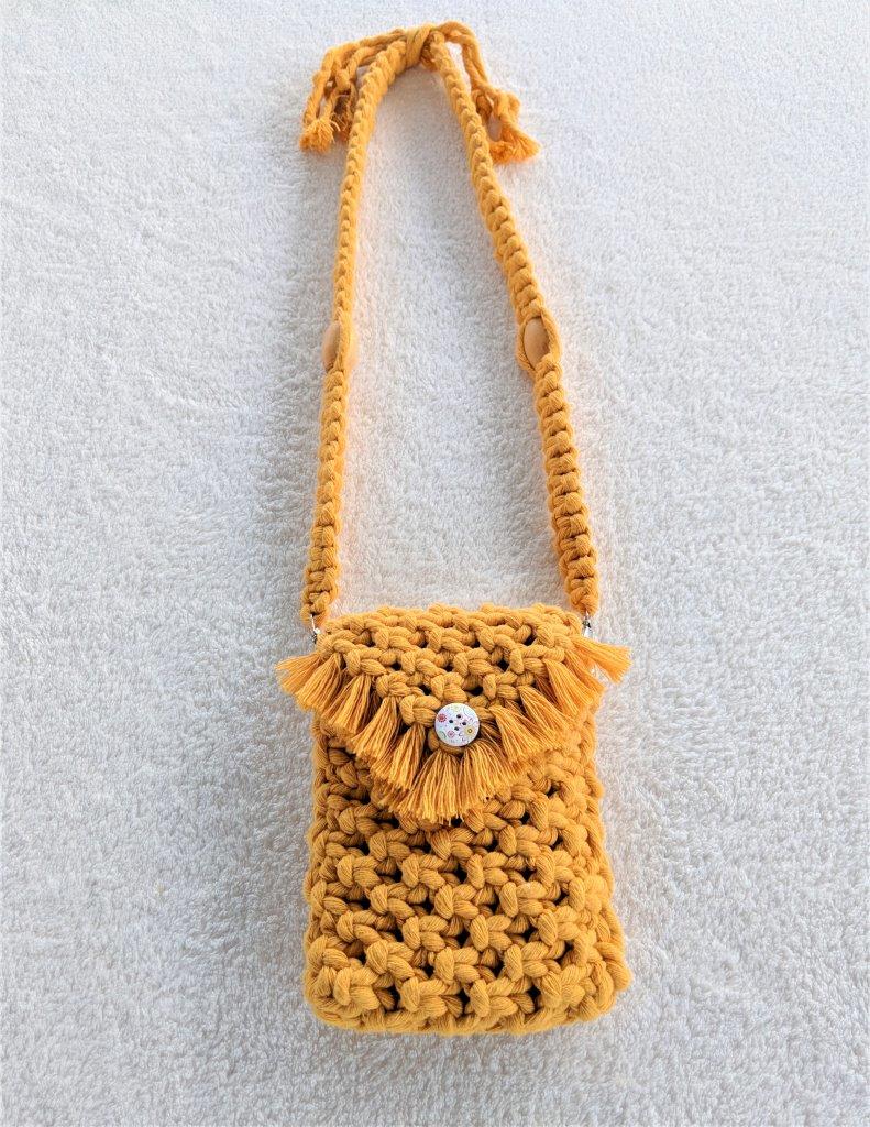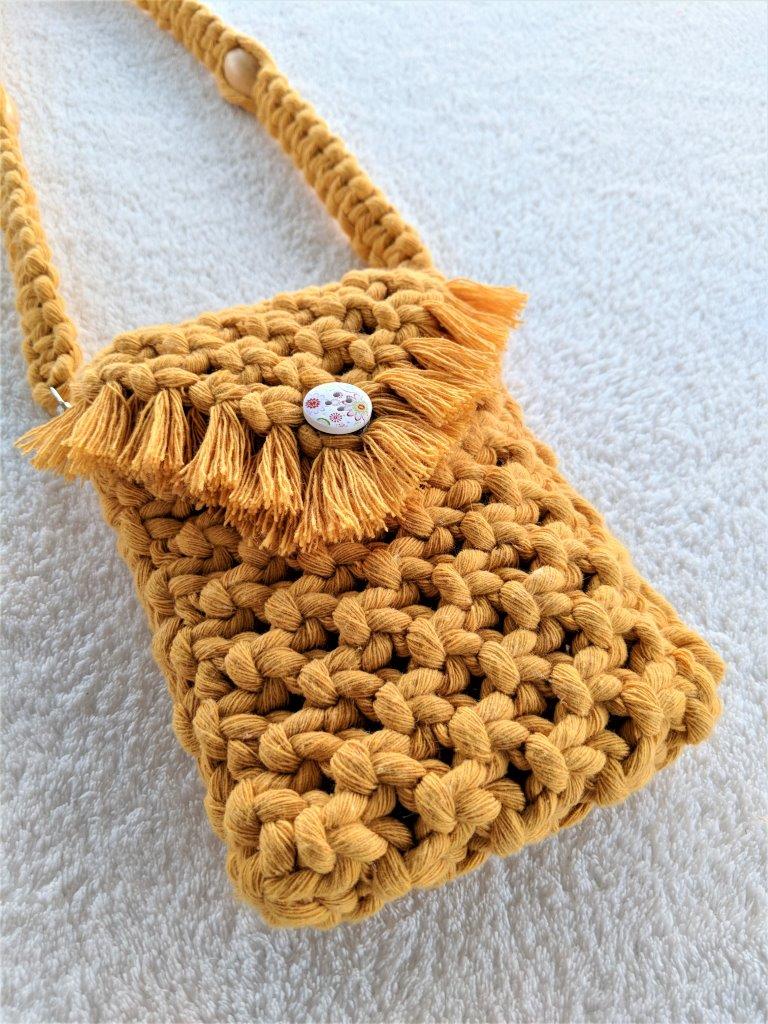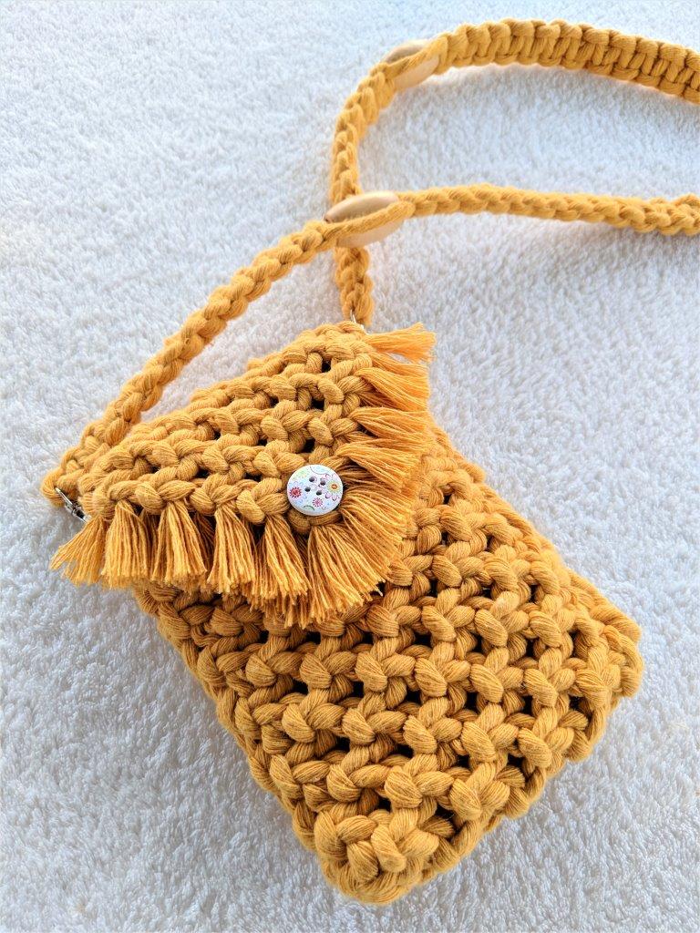 Μοναδική χειροποίητη μακραμέ boho  τσάντα  με λουρί ώμου σε μουσταρδί  χρώμα  .Ένα όμορφο δώρο που κάνει κάθε κορίτσι μοναδικό στις εμφανίσεις του.Πλεγμένη από 100% ανακυκλωμένο βαμβακερό κορδόνι. Συνοδεύεται από προσεγμένο χάρτινο κραφτ κουτί συσκευασίας φιλικό προς το περιβάλλον.