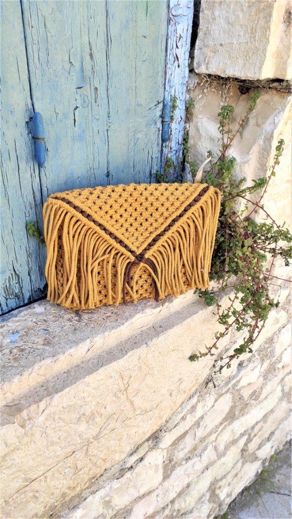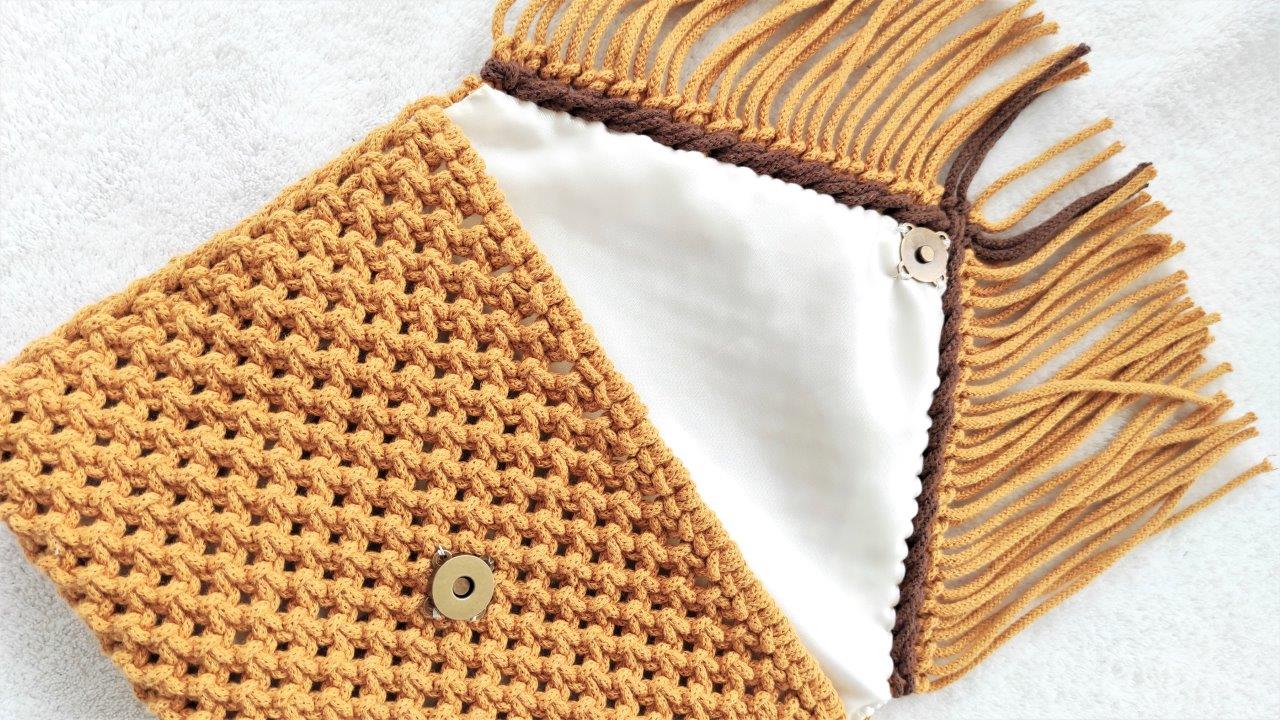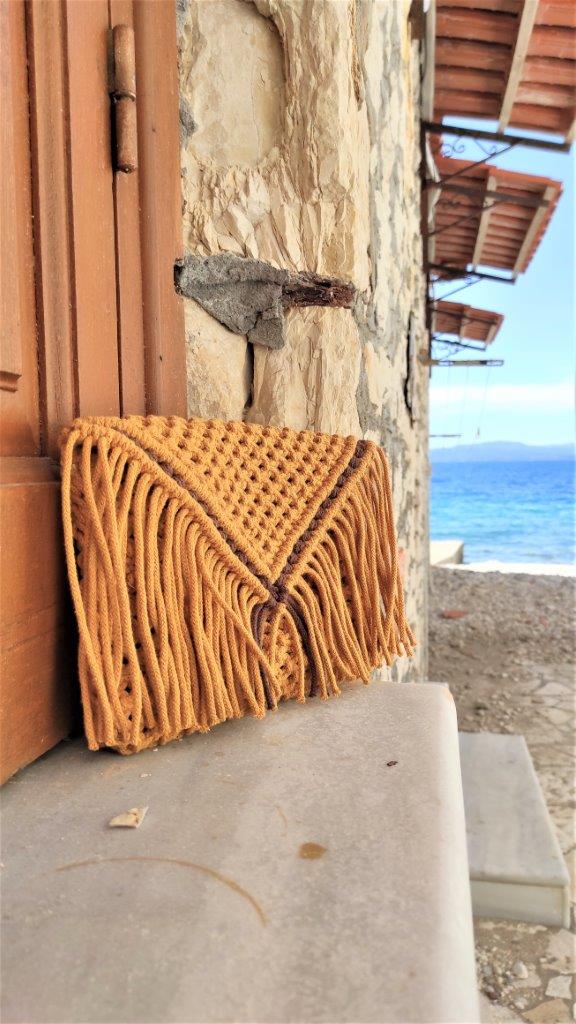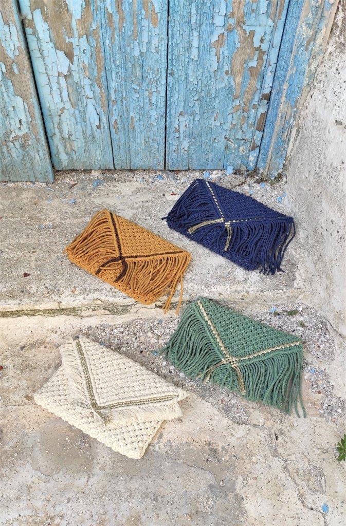 Boho χειροποίητη μακραμέ τσάντα – φάκελος με χρυσή λεπτομέρεια , πλεγμένη εξ ολοκλήρου στο χέρι με 100% ανακυκλωμένο βαμβακερό σχοινί. Επενδυμένη με  σατέν φόδρα και vintage κούμπωμα. Μπορεί να σας συνοδεύσει σε όλες τις εμφανίσεις σας από το πρωί ως το βράδυ. Μια διαχρονική επιλογή τσάντας που θα απογειώσει το στυλ και την εμφάνιση σας. Διατίθεται σε πολλές αποχρώσεις.