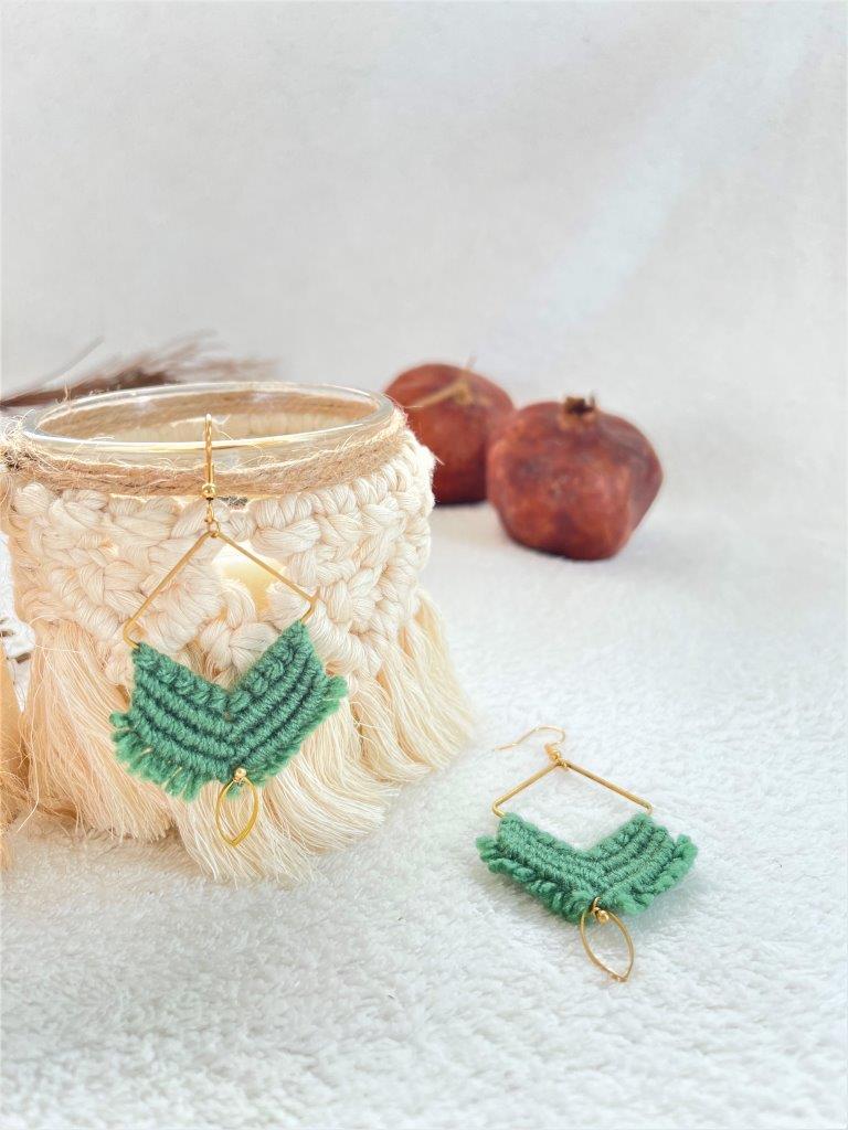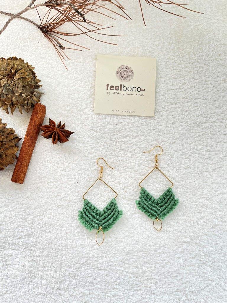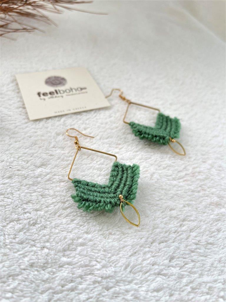Μοναδικά χειροποίητα μοντέρνα κρεμαστά macrame σκουλαρίκια πλεγμένα με 100% ανακυκλωμένο  κορδόνι στο χρώμα του ευκάλυπτου ,πάνω σε ορειχάλκινο ρόμβο με επιχρυσωμένο ατσάλινο γάντζο. Ιδανική επιλογή για όσους λατρεύουν το boho style. Συνοδεύεται από προσεγμένο χάρτινο κραφτ κουτί συσκευασίας φιλικό προς το περιβάλλον.