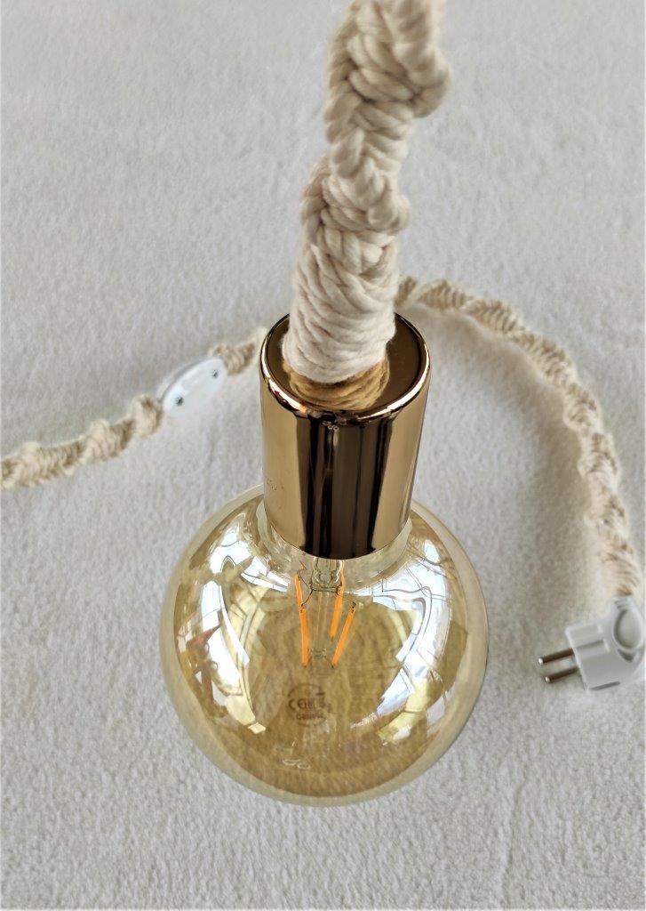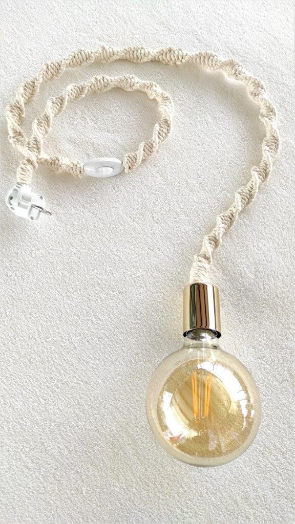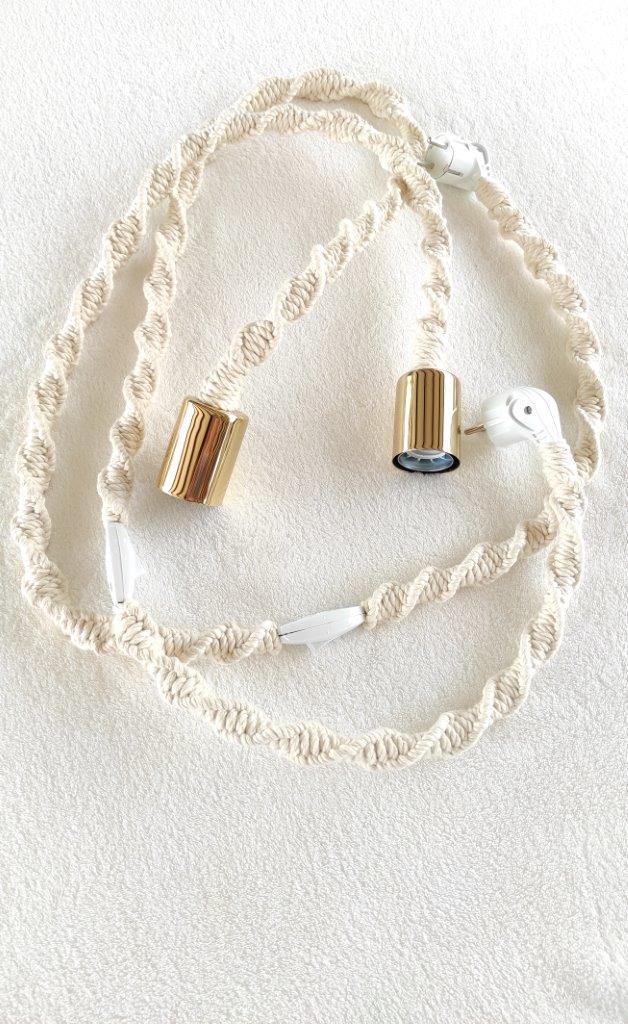 BOHO χειροποίητο μακραμέ φωτιστικό με μεταλλικό χρυσό ντουί, διακόπτη και φις σούκο . Η πλέξη μακραμέ είναι από 100% ανακυκλωμένο βαμβακερό κορδόνι φιλικό προς το περιβάλλον. Ιδανική επιλογή για όσους λατρεύουν το bohostyle  και θέλουν να δώσουν μια bohem πινελιά στο χώρο τους. Το μήκος του καλωδίου προσαρμόζεται ανάλογα τις ανάγκες σας κατόπιν παραγγελίας .Επικοινωνήστε μαζί μας για περισσότερες πληροφορείς. Διαθέσιμες διάφορες αποχρώσεις σε ντουί. Ο λαμπτήρας δεν συμπεριλαμβάνεται στην τιμή.