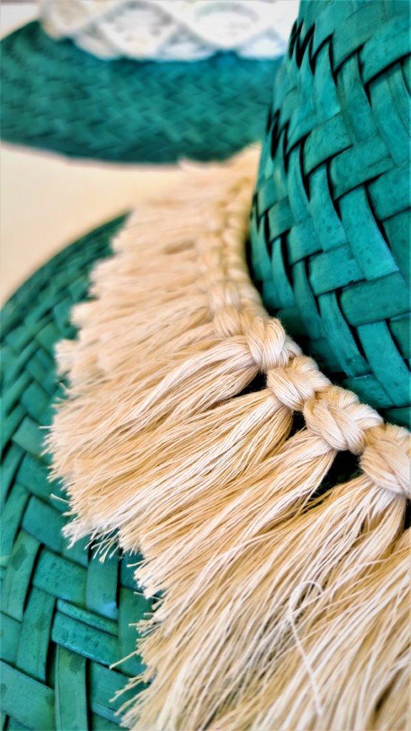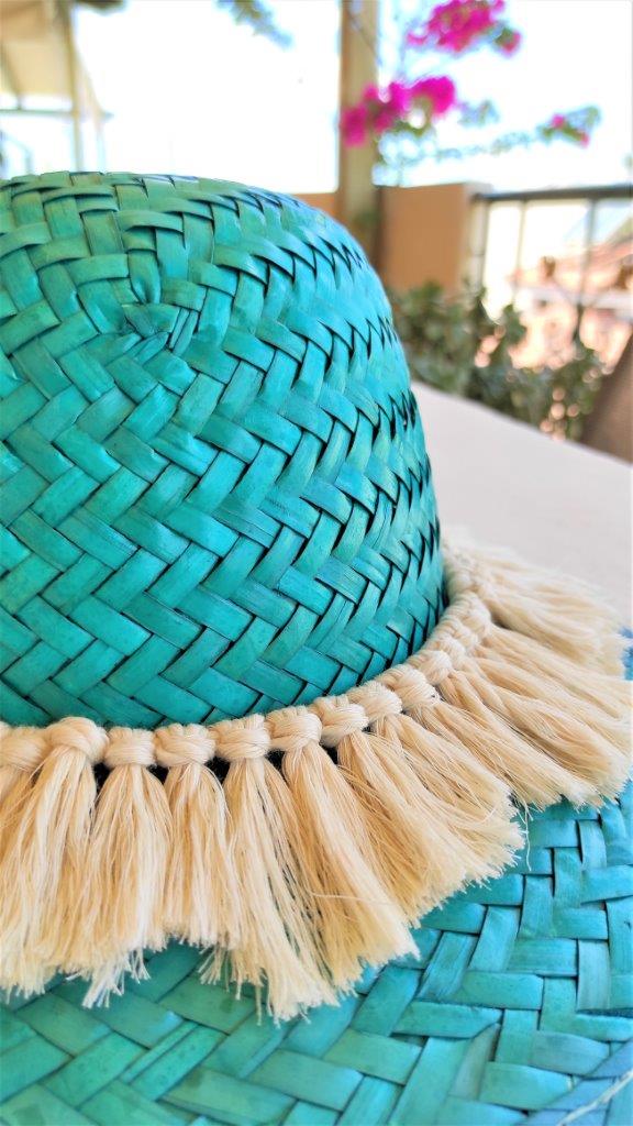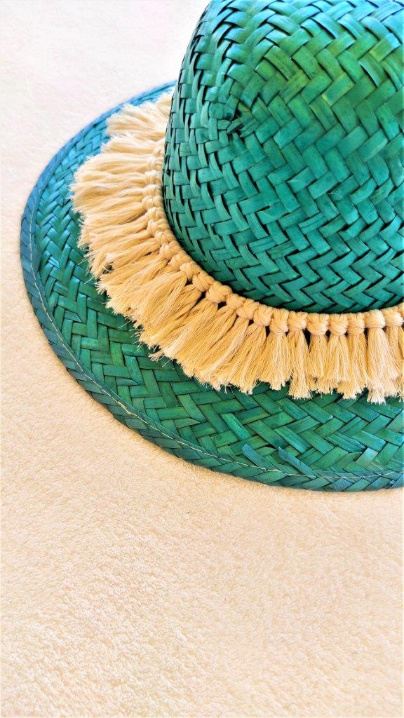 Mοναδικό πετρόλ ψάθινο καπέλο με λεπτομέρεια πλέξης μακραμέ από 100% ανακυκλωμένο  βαμβακερό κορδόνι. Ιδανική επιλογή για όσους λατρεύουν το boho style και θέλουν να ξεχωρίσουν με τις εμφανίσεις τους το καλοκαίρι .