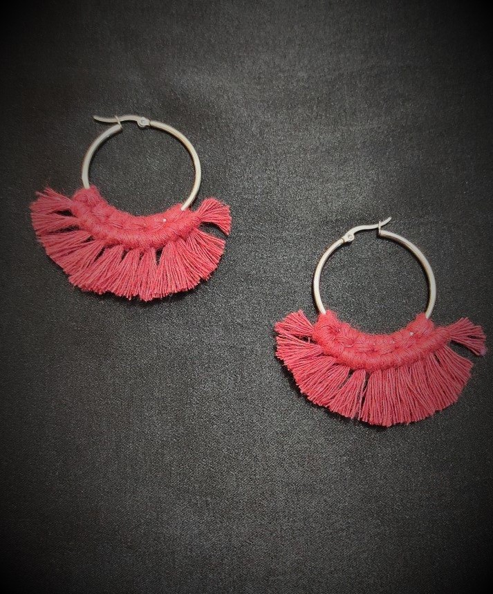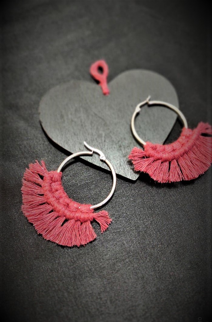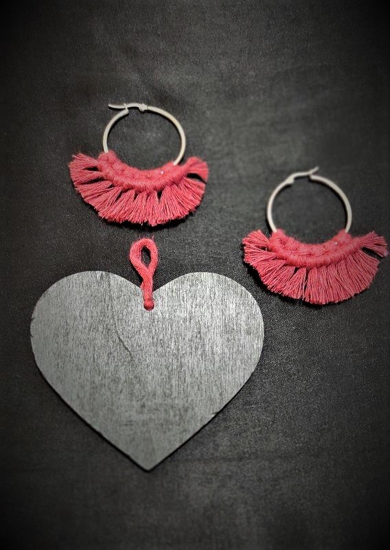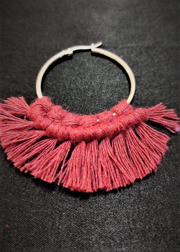 Μοναδικά χειροποίητα μοντέρνα macrame σκουλαρίκια πλεγμένα με βαθύ κόκκινο 100% ανακυκλωμένο βαμβακερό κορδόνι πάνω σε ατσάλινο κρίκο. Ένα όμορφο δώρο να χαρίσετε  για τη γιορτή του Αγίου Βαλεντίνου και όχι μόνο. Ιδανική επιλογή για όσους λατρεύουν το boho style.Συνοδεύεται από προσεγμένο χάρτινο κραφτ κουτί συσκευασίας φιλικό προς το περιβάλλον.