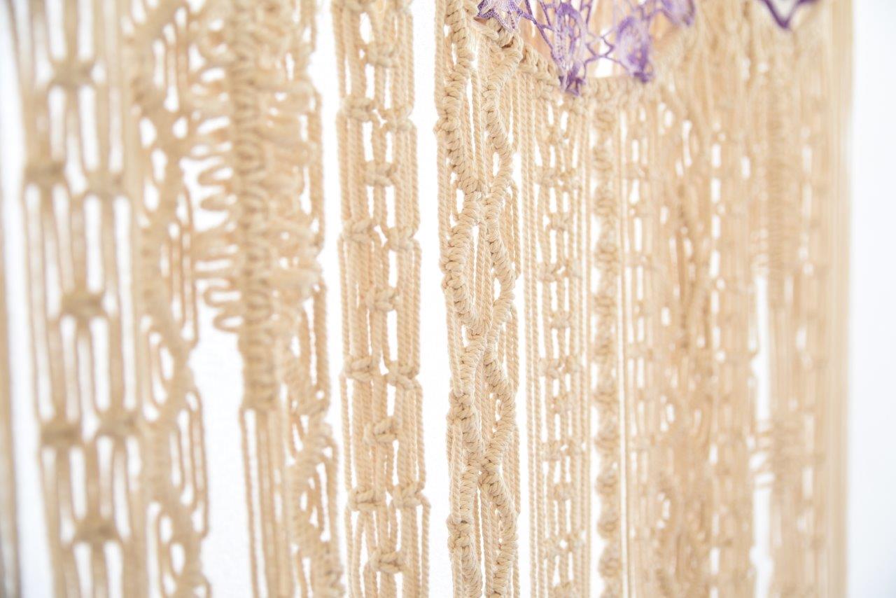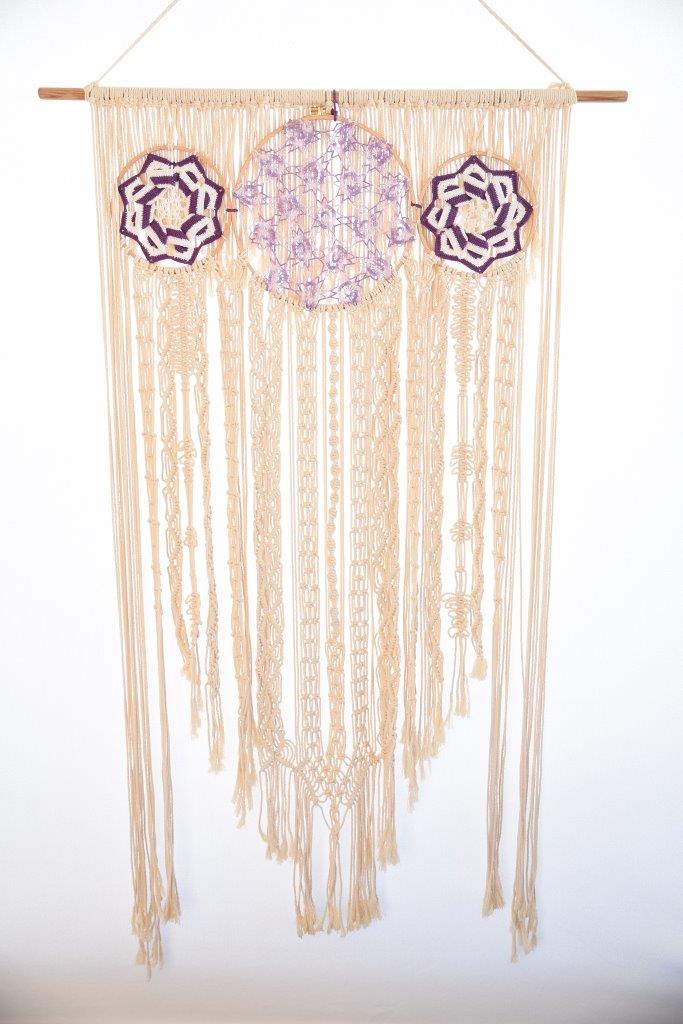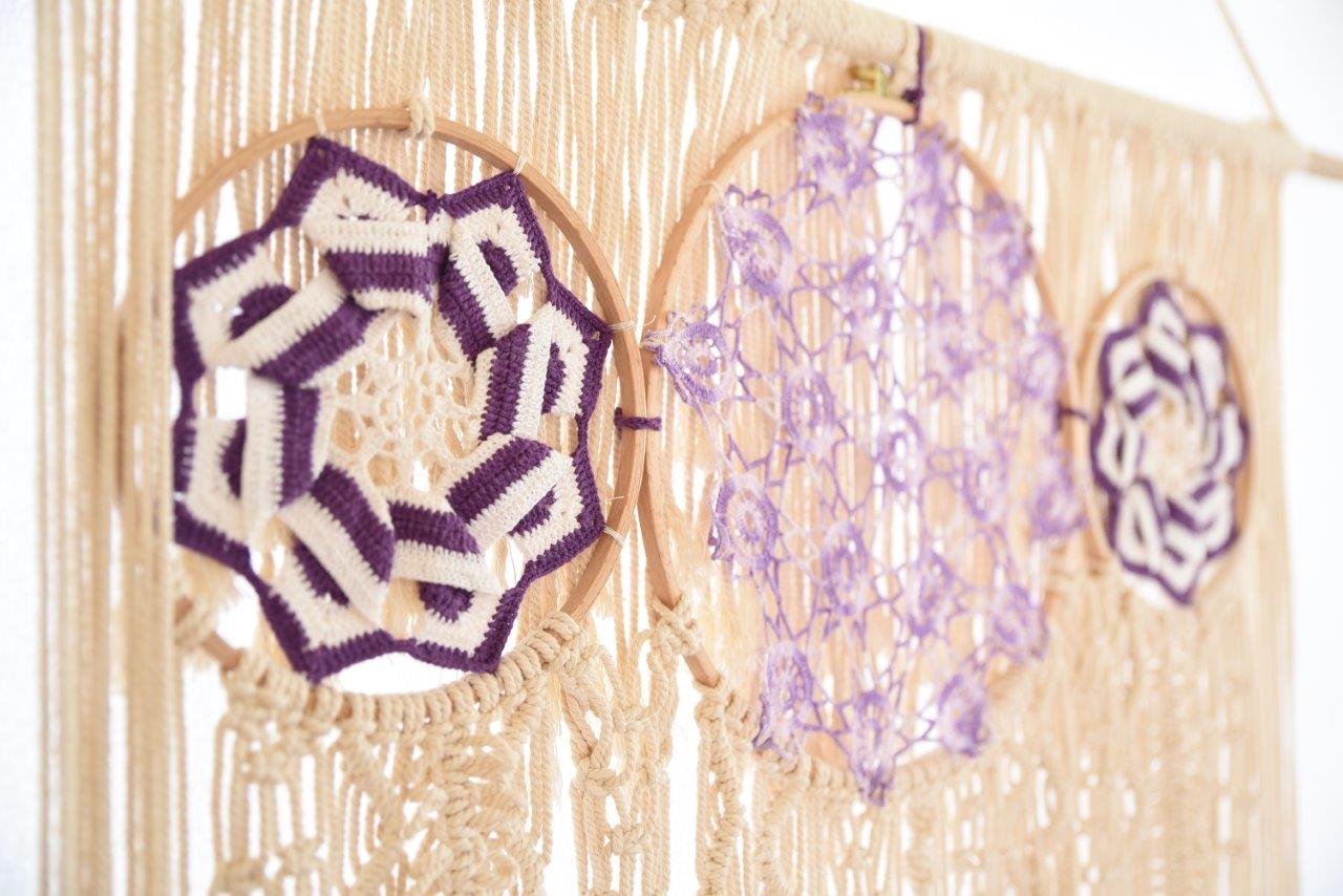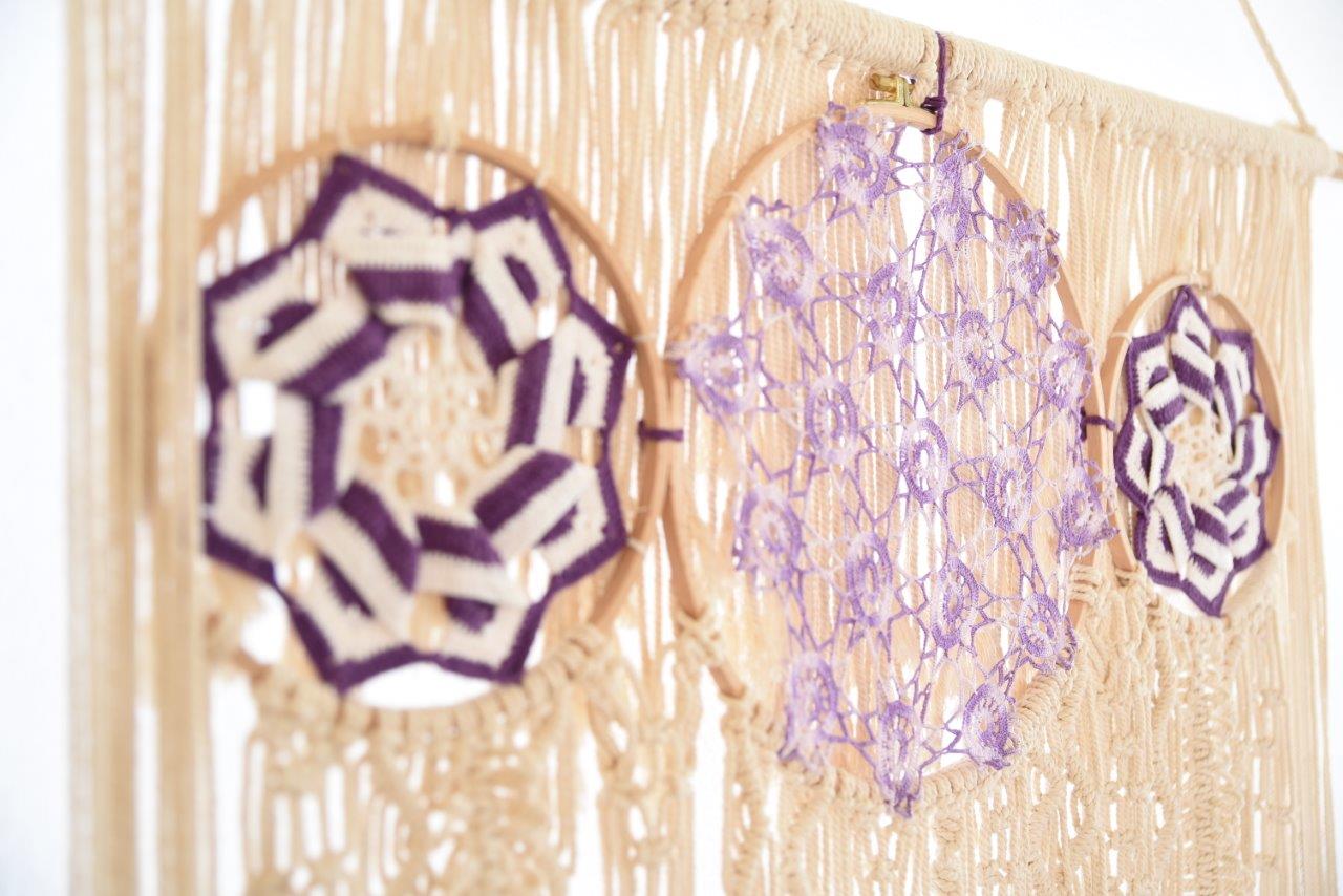 Μοναδικό χειροποίητο μοντέρνο macramé κρεμαστό τοίχου, πλεγμένο από 100% ανακυκλωμένο βαμβακερό κορδόνι πάνω σε φυσικό ξύλο. Αποτελείται από τρεις ονειροπαγίδες πλεγμένες στο χέρι με βελονάκι και κρόσσια πλεγμένα με την τεχνική του macramé.Μπορεί να διακοσμήσει τόσο το χώρο του σαλονιού σας  όσο  και του  υπνοδωματίου  σας. Ιδανική επιλογή για όσους λατρεύουν την boho  και ethnic διακόσμηση και θέλουν να χαρίσουν μια boem πινελιά στο χώρο τους. Το χρώμα της λεβάντας σε συνδυασμό με τους αμέτρητους κόμπους πλεγμένους κάτω από  από τις ονειροπαγίδες ,θα προσδώσουν μια ξεχωριστή αισθητική χαλάρωσης και ηρεμίας στο χώρο σας.