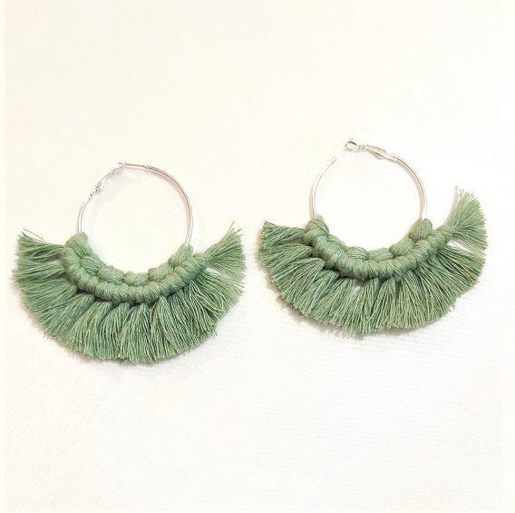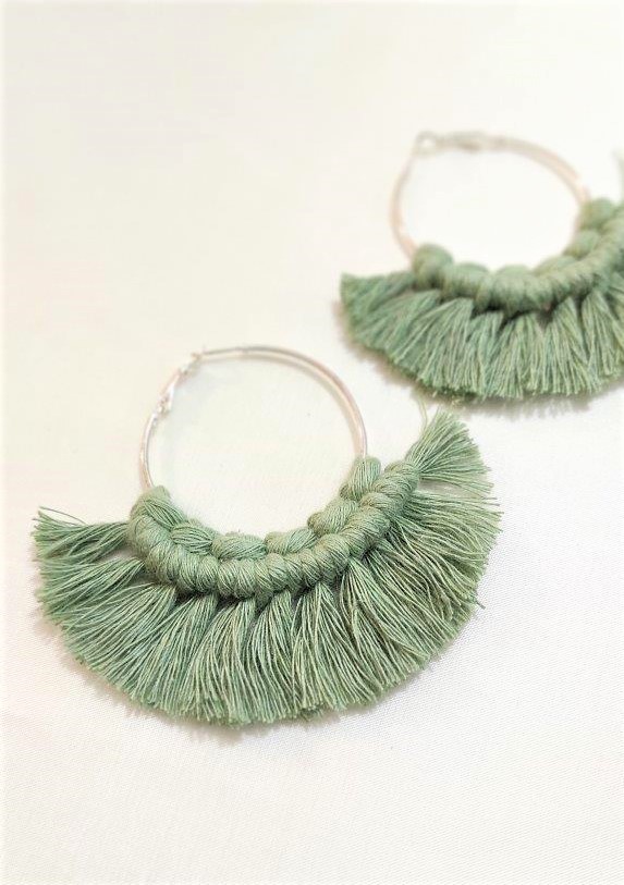 Μοναδικά χειροποίητα μοντέρνα macrame σκουλαρίκια πλεγμένα με 100% ανακυκλωμένο  βαμβακερό κορδόνι στο χρώμα του ευκάλυπτου ,πάνω σε ορειχάλκινο κρίκο. Ιδανική επιλογή για όσους λατρεύουν το boho style.Συνοδεύεται από προσεγμένο χάρτινο κραφτ κουτί συσκευασίας φιλικό προς το περιβάλλον.