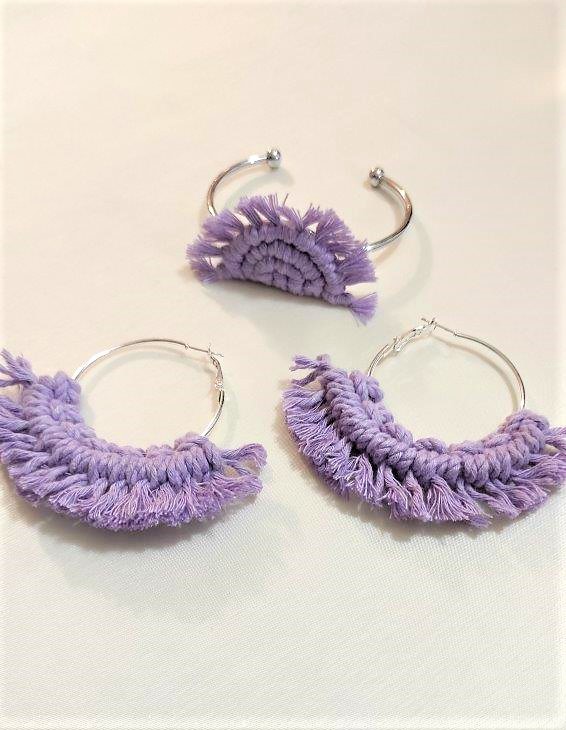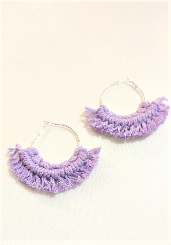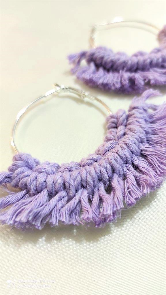 Μοναδικά χειροποίητα μοντέρνα macrame σκουλαρίκια πλεγμένα με 100% ανακυκλωμένο  βαμβακερό κορδόνι στο χρώμα της λεβάντας ,πάνω σε ορειχάλκινο κρίκο. Ιδανική επιλογή για όσους λατρεύουν το boho style.Συνοδεύεται από προσεγμένο χάρτινο κραφτ κουτί συσκευασίας φιλικό προς το περιβάλλον.