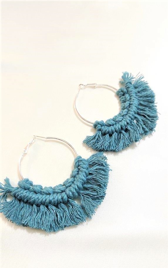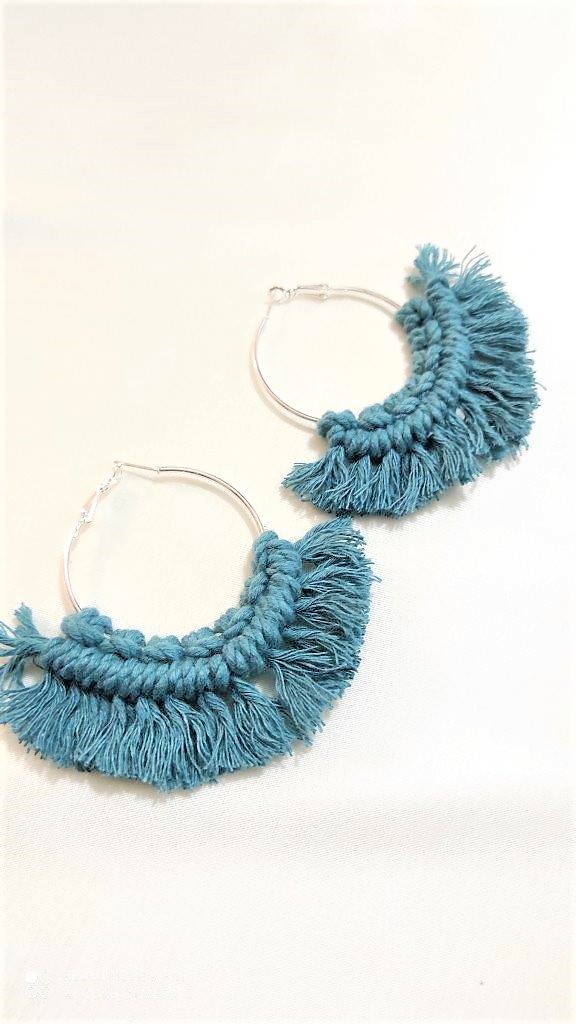 Μοναδικά χειροποίητα μοντέρνα macrame σκουλαρίκια πλεγμένα με 100% ανακυκλωμένο  βαμβακερό κορδόνι σε χρώμα πετρόλ ,πάνω σε ορειχάλκινο κρίκο. Ιδανική επιλογή για όσους λατρεύουν το boho style.Συνοδεύεται από προσεγμένο χάρτινο κραφτ κουτί συσκευασίας φιλικό προς το περιβάλλον.