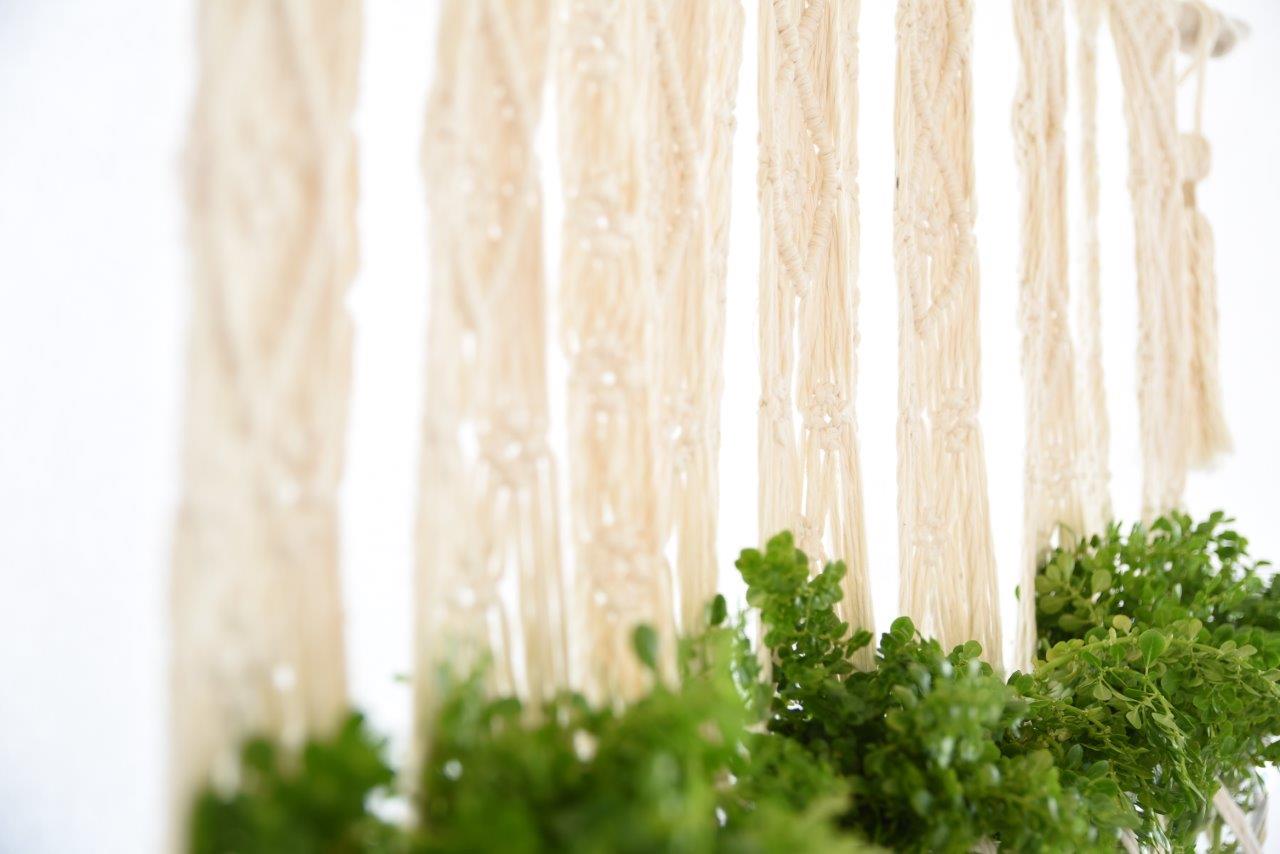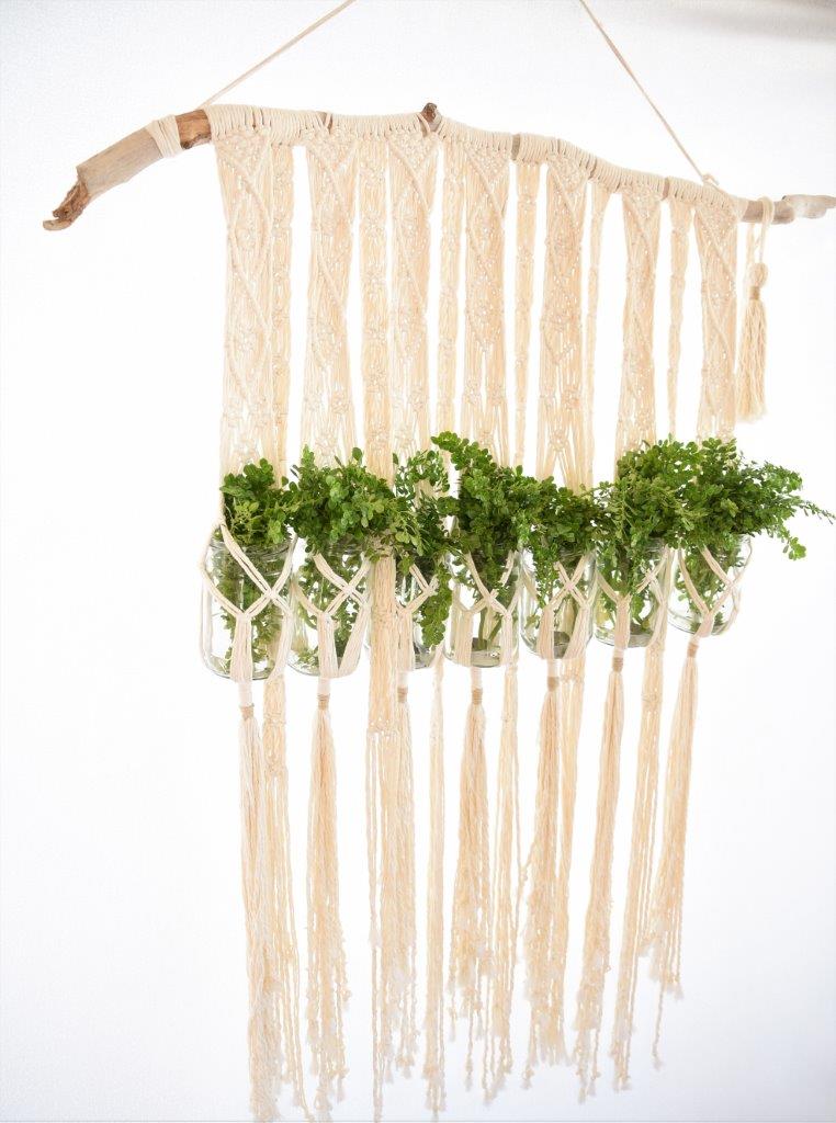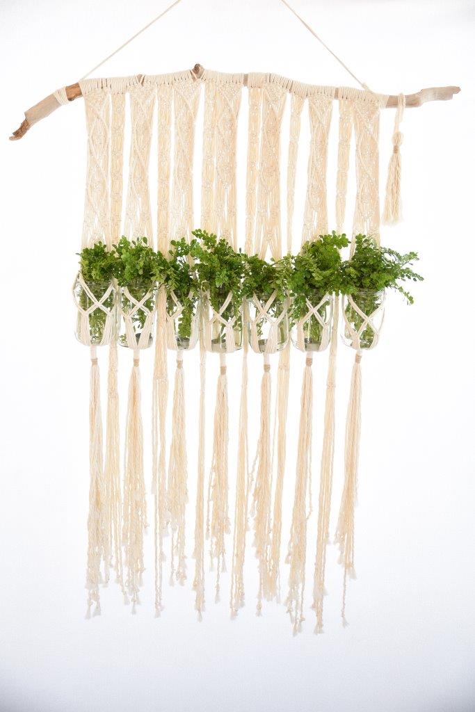 Μοναδικό χειροποίητο μοντέρνο  macramé  κρεμαστό τοίχου, πλεγμένο από 100% ανακυκλωμένο βαμβακερό κορδόνι πάνω σε φυσικό ξύλο. Περιέχει επτά θήκες για γυάλες μέσα στις οποίες μπορείτε να τοποθετήσετε αρωματικά κεριά ή λουλούδια κάθε εποχής. Μια πρότυπη επιλογή για ένα ξεχωριστό χειροποίητο δώρο.Ιδανική επιλογή για όσους λατρεύουν την boho,ethnic και vintage διακόσμηση και θέλουν να χρίσουν μια bohem πινελιά στο χώρο τους. Κατάλληλο τόσο για εσωτερικό  όσο και για εξωτερικό χώρο. Οι γυάλες είναι του ενός λίτρου και συμπεριλαμβάνονται  στην τιμή.