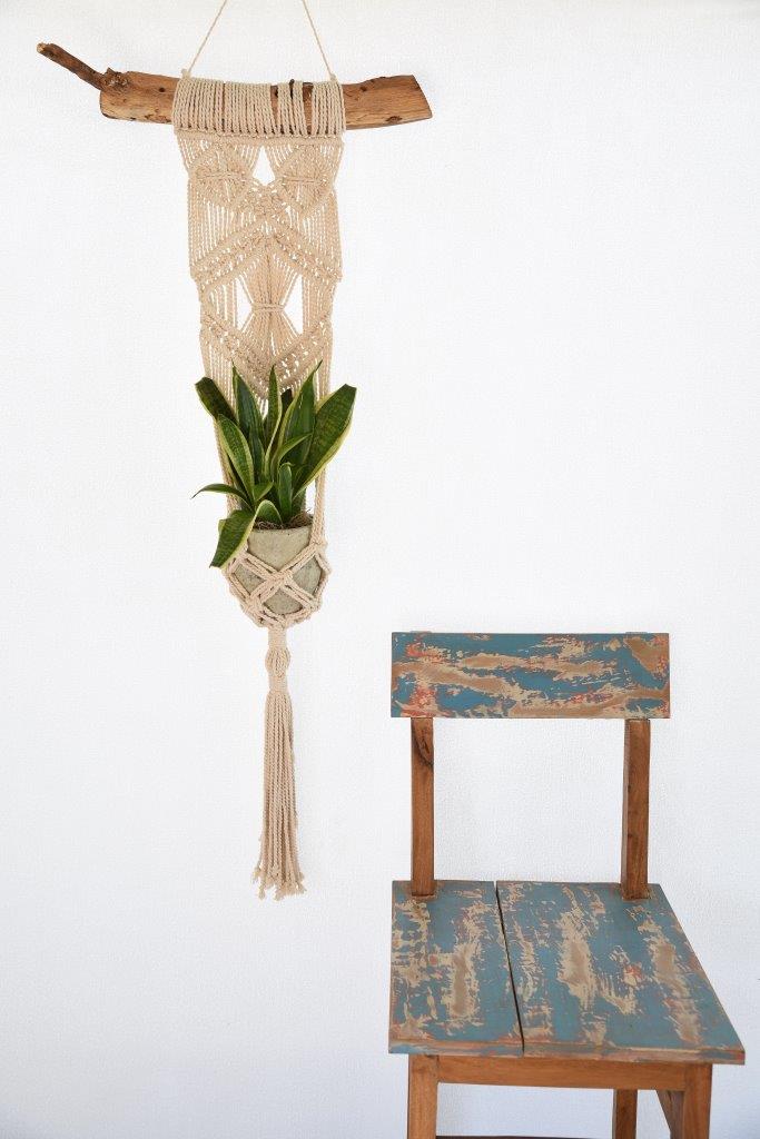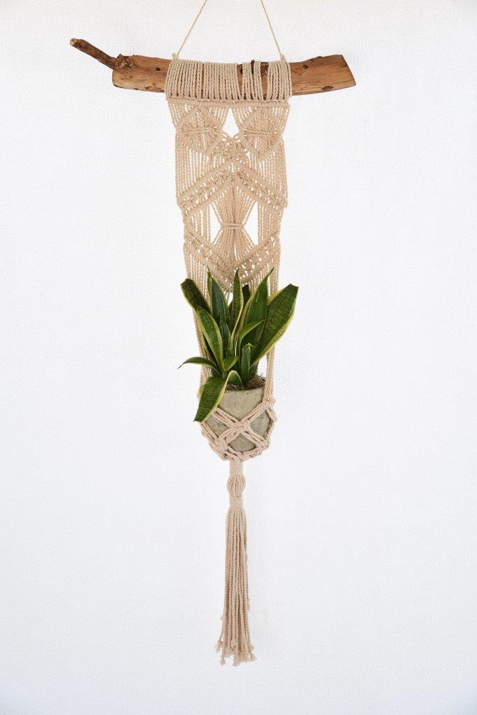 Μοναδικό χειροποίητο μοντέρνο  macramé  κρεμαστό τοίχου, πλεγμένο από 100% ανακυκλωμένο βαμβακερό κορδόνι  πάνω σε φυσικό ξύλο . Μπορεί να χρησιμοποιηθεί ως βάση για κάποιο φυτό, καθώς επίσης και ως βάση για μια γυάλα και όχι μόνο. Ιδανική επιλογή για όσους λατρεύουν την boho,ethnic και vintage διακόσμηση και θέλουν να χρίσουν μια bohem πινελιά στο χώρο τους. Κατάλληλο τόσο για εσωτερικό  όσο και για εξωτερικό χώρο.