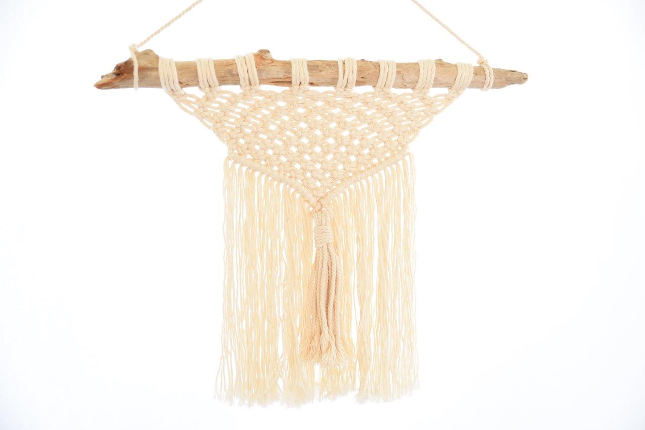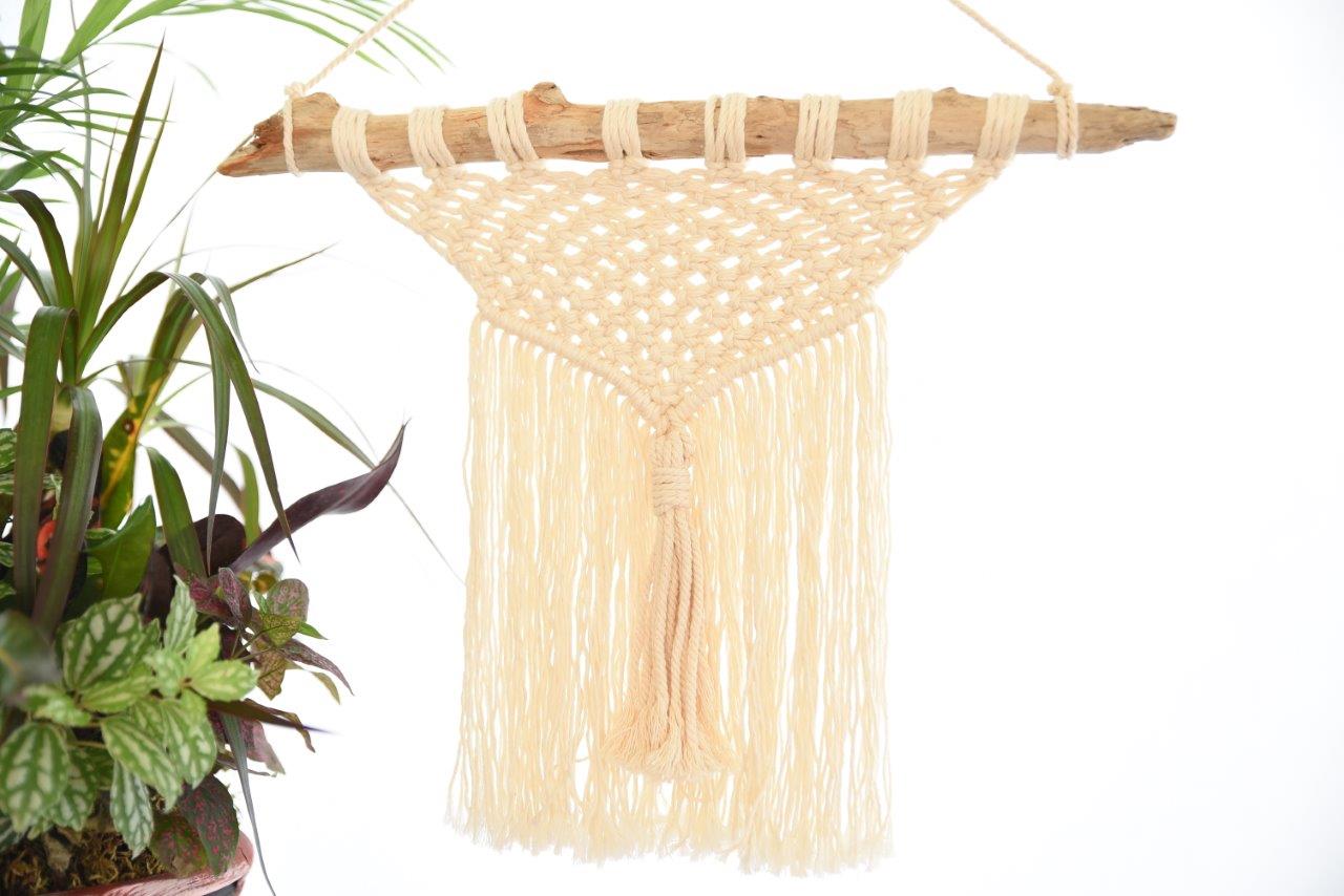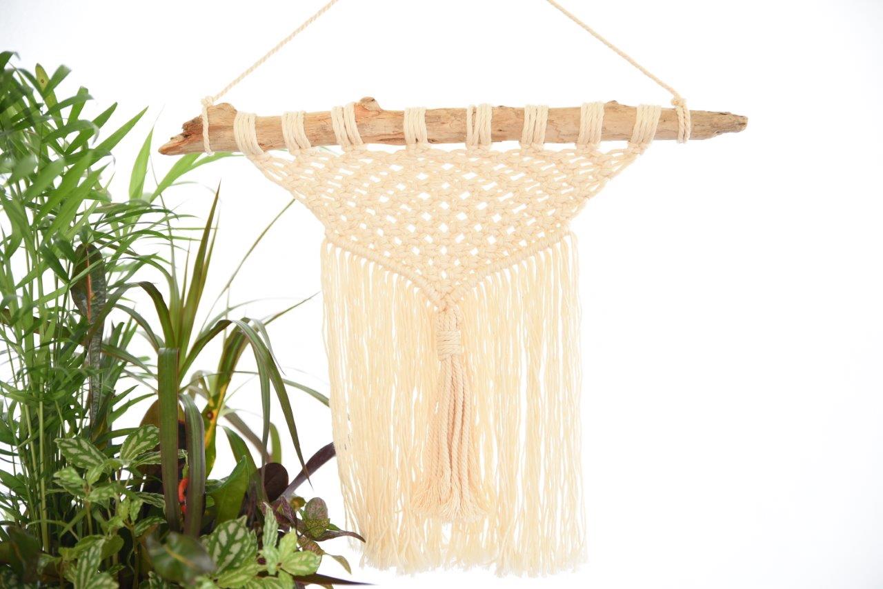 Μοναδικό χειροποίητο μοντέρνο  macramé  κρεμαστό τοίχου, πλεγμένο από 100% ανακυκλωμένο βαμβακερό κορδόνι  πάνω σε φυσικό ξύλο. Μια πρωτότυπη επιλογή για ένα ξεχωριστό χειροποίητο δώρο. Ιδανική επιλογή για όσους λατρεύουν την boho,ethnic και vintage διακόσμηση και θέλουν να χαρίσουν μια bohem πινελιά στο χώρο τους. Κατάλληλο τόσο για εσωτερικό  όσο και για εξωτερικό χώρο.