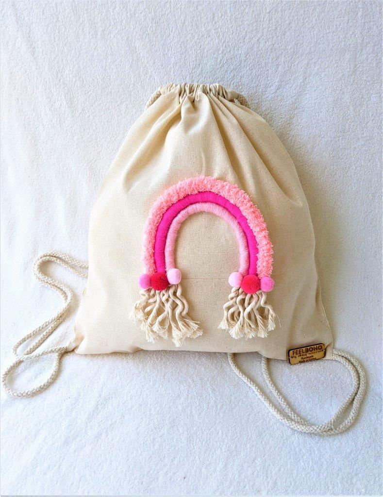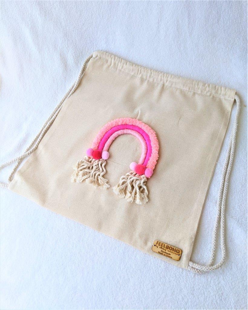 Eco boho πάνινη τσάντα πλάτης διακοσμημένη με χειροποίητο ουράνιο τόξο. Μπορεί να συνοδεύσει την εμφάνιση σας από το πρωί ως το βράδυ. Μια πρωτότυπη επιλογή για τις καλοκαιρινές διακοπές σας ακόμα και στην παραλία .