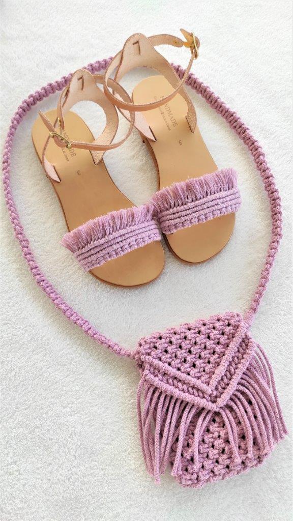 Παιδικά χειροποίητα δερμάτινα σανδάλια ελληνικής κατασκευής διακοσμημένα με πλέξη μακραμέ από 100% ανακυκλωμένο βαμβακερο κορδόνι σε χρώμα απαλό ροζ . Ιδανική επιλογή για boho κορίτσι. Συνδυάζεται με μακραμέ χειροποίητο τσαντάκι της ίδιας απόχρωσης.