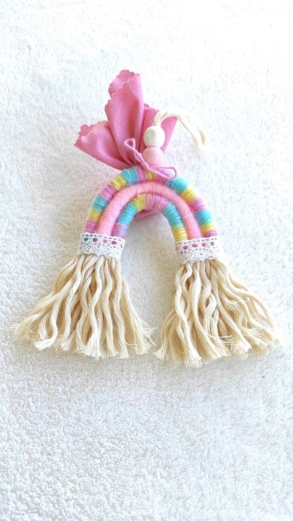 Μοναδικό χειροποίητο μοντέρνο macramé  τοίχου μίνι ουράνιο τόξο. Ιδανική επιλογή τόσο για μπομπονιέρα βάπτισης όσο και για αναμνηστικό γεννήσεως. Πρωτότυπη χειροποίητη ξεχωριστή δημιουργία που μπορεί να διακοσμήσει χαρούμενα τον τοίχο του παιδικού δωμάτιου και όχι μόνο. Μια ιδιαίτερη πρόταση για οικονομικό χειροποίητο παιδικό δώρο. Διατίθεται σε διάφορες αποχρώσεις. Ελάχιστη παραγγελία  25  τεμάχια.  Παρακαλώ επικοινωνήστε μαζί μας για περισσότερες πληροφορίες.
